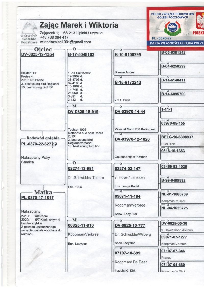 Oryginalny gołąb z hodowli W.M. Zając. Więcej informacji w rodowodzie lub pod numerem telefonu 663699109
