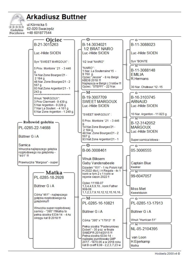 PL-0285-22-14688 Fajna samiczka wnuczka najlepszego samca rozpłodowego - 461 ! Ojciec to oryg od H & L Sioen linia Nairo - najlepszego samca rozpłodowego oraz wnuczka Sweet Margoux - super wdowy ! "461" najważniejsze referencje z 2025/2026 roku: Prawnuk 5510- Kolegi Jacka Orszulika 2 As Polski kat A - kandydat na Olimpiadę 2026 w Dortmundzie !!!....z 2024 roku: 1 As Rejonu z 8 lotów rejonowych - prawnuczka 461 u Kol Adama Gasperowicza, prawnuk "461" wygrał finał na WG Podhale wygrywając 50 000 dla Kolegi Bogdana Bieli !- liczba jedynek jego wnuków , prawnuków i oczywiście dzieci będzie około stu a kilkadziesiąt gołębi z 461 zajmowało top 10 w kat As w różnych kategoriach w różnych okręgach w Polsce- tylko w 2022 roku w 9 różnych oddziałach przeważnie prawnuki zdobywały 1 lokatę w oddz !!! Jego wnuczka została też na olimpiadzie w tym roku 4 gołębiem świata w kat H dla Kol Łukasza Reguły. !! Na screenie przykład jak potrafią siadać gołębie w oddz z linii 461 ... 3-prawnuk,4 -wnuk , 5-wnuk , 6 - roczna wnuczka - kat A 9 z groszem ma , 7 wnuk , 11 - wnuk oraz 15 - wnuk 461. oraz kolejny lot z 2020 roku : 1,2,3,5,7,8 wnuk oraz 15 prawnuk ? do tego roczna samiczka Kolegów Piotra I Marcina Żureckich z Kępna została 6 asem Polski w kat G ...tak leciała... 2 na 5200 g ze 174 km 8 na 4573 z 219 km 8 na 3583 g z 324 km 8 na 1764 g z 324 g 21 na 4535 g z 549 km - rej - coeff jak widać na zdjęciu 13,54 miała też szósty super lot była 25 na 4984 g coeff 5,02 1 goląb z Extra finału na WG Giewont 2022 dla Teamu Chudy-Molek to też linia "461" ojciec to syn mojej super wdowy 2161-12 ,, Dwie Prawnuczki .... u Kol Kazimierza Goździejewskiego ( jedna w kat M w 2023 roku miała coeff 4,84 ( 1 as okręgu Wałbrzych a druga w 2024 roku 2,58 - 2 x 1 na oddział (2 as Polski kat M w/g miesięcznika "Hodowca") - w kat "I" - coeff 9 z haczykiem), "461" to też pradziadek PL-0122-22-2219 - w 2 sezony na 21 wkładań 20 konkursów - kat A coeff 9,08 a z dwóch lat do wystaw kat A-74,86 , kat B-65,94 a kat D-72,20 W 2023 roku zdobył 1 konk na ok 4100 gołębi z miejsc Sulechów a w 2024 roku 2 x 2 konk w oddz !!! oraz pradziadek PL-0122-22-5510 w kat A w 2024 roku uzyskał coeff. 4,75 Zdobył też 1 konk na oddz z miejsc. Brzeg Dolny na 4322 gołębie !! Został też 4 Asem Polski kat krótki dystans 2024 z coeff 17 z groszem z 5 lotów do kat A właśnie dla Kolegi Jacka Orszulika !!! oraz wiele,wiele innych.....od 2017 roku 30x mistrzostwo oddz w różnych kategoriach w tym 2019-2021 3 x z rzędu supermistrzostwo oddziału Poznań, więcej info 601 877 544 youtube.com/watch?v=PnrNZw6FUk4
