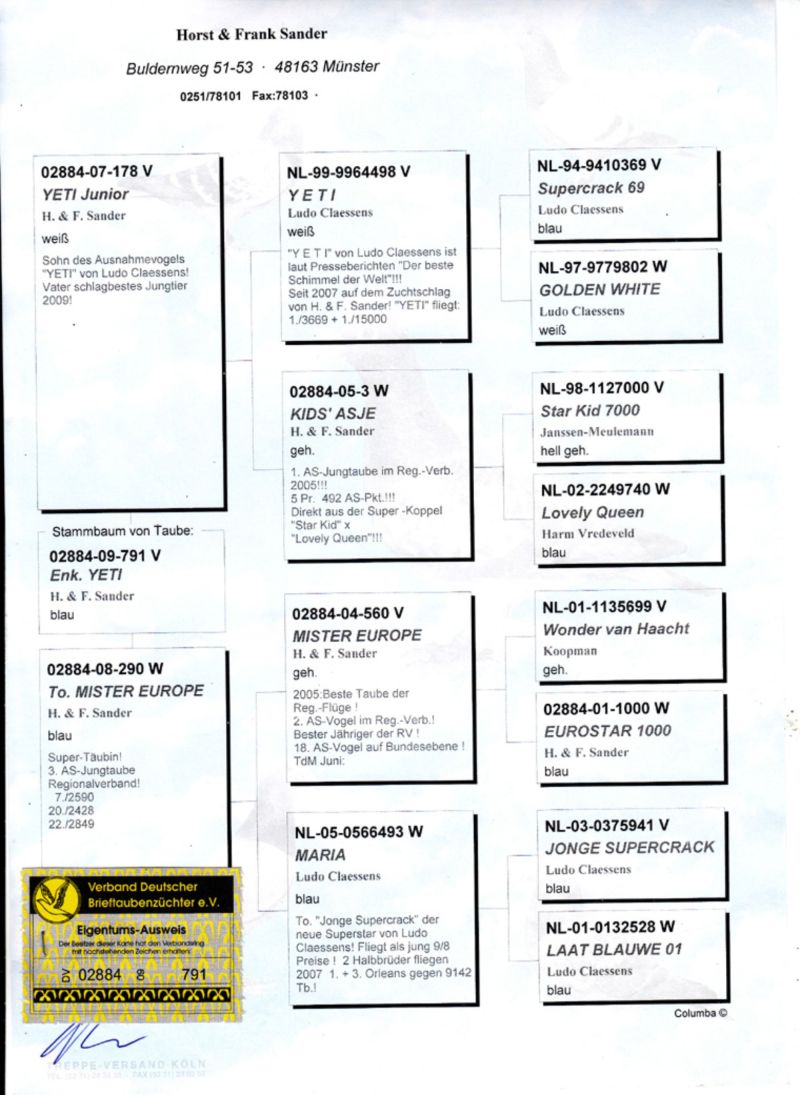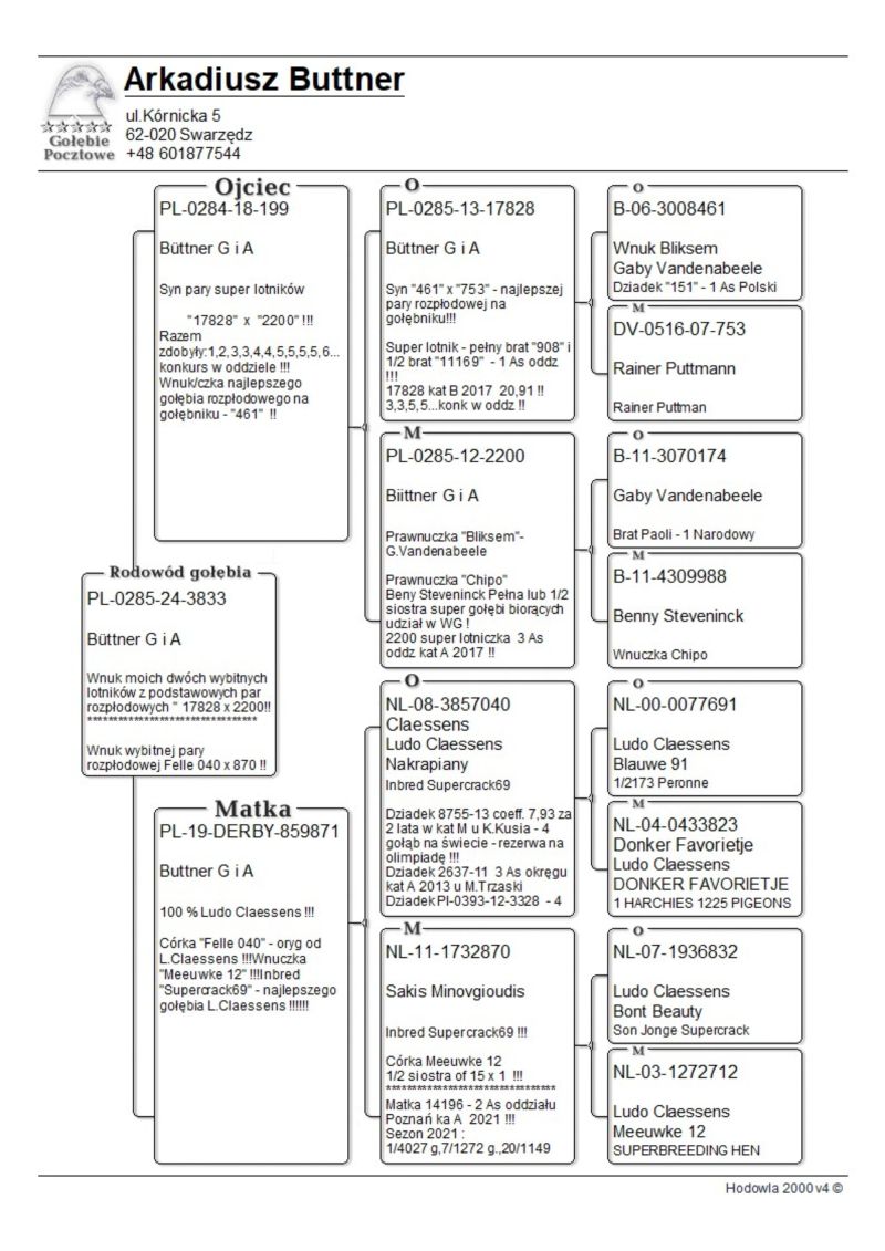 "9988" - matka "Luny" , Casandry" , "17703" - super gołębi które razem ugrały na WG około 20 tyś zł, babcia 8127 - wygrała ponad 10 tyś zł w finale Pattaya OLR 2023/2024 oraz wielu wybitnych innych " gołębi lotowych i rozpłodowych tnych samców rozpłodowych - "461" i "174" !!"Felle 040" dziadek m.in 8755 , który dla Kol . Krzyśka Kusia wylatał 4 wynik w Polsce w kat olimpijskie E i był gołębiem rezerwowym na olimpiadę. Jest też pradziadkiem PL-0122-22-2219 - w 2 sezony na 21 wkładań 20 konkursów - kat A coeff 9,08 a z dwóch lat do wystaw kat A-74,86 , kat B-65,94 a kat D-72,20
