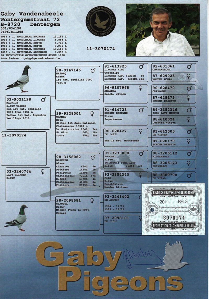 Fajny samczyk ,złożony, średni wnuk Felle 040 x 870 - dwóch wybitnych gołębi rozpłodowych Ludo Claessens oraz wnuk dwóch wybitnych lotników ( w drużynie IX przod. Polski kat GMP 2017).Prawnuk dwóch wnuków "Bliksem" od Gaby Vandenabeele wybi