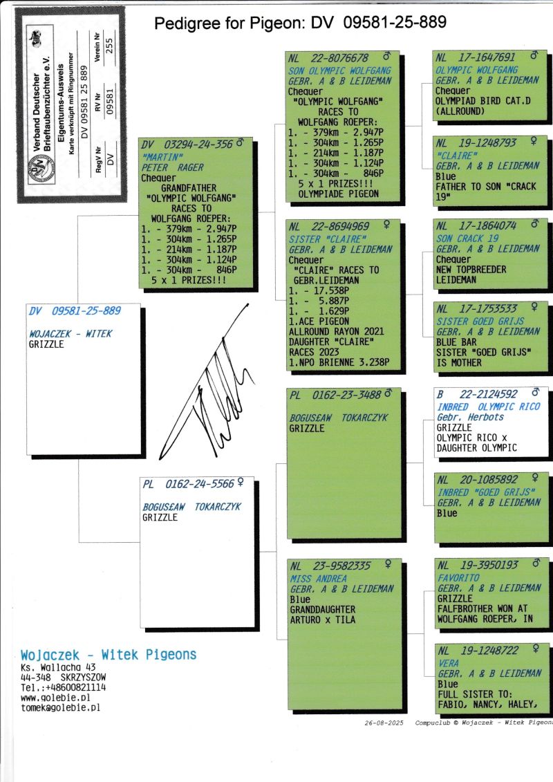 KOSZT TRANSPORTU 120 ZŁ (maksymalnie 3 gołębie w jednej paczce). KOSZTA ZA GOŁĘBIA I TRANSPORT KLIENCI BĘDĄ PŁACIĆ BEZPOŚREDNIO KIEROWCY KTÓRY PRZYWIEZIE GOŁĘBIE. Gołąb z hodowli WOJACZEK-WITEK. Szczegóły pochodzenia w rodowodzie. Kontakt w sprawie gołębi oraz transportu pod numerem telefonu +48 600 821 114