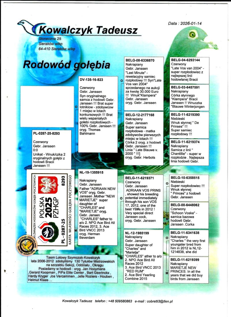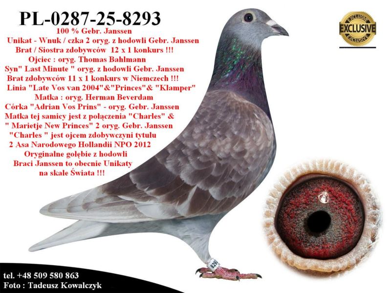 PL-0287-25-8293 Unikat - Wnuk/czka 2 oryginalnych gołębi z hodowli Braci Janssen