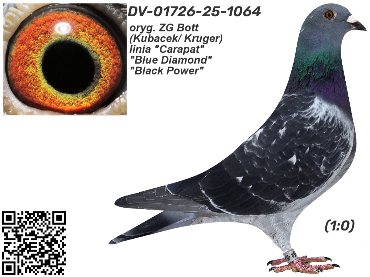 oryg. ZG Bott (Kubacek/ Kruger), linia "Carapat", "Blue Diamond", "Black Power" Szczegóły pochodzenia w rodowodzie. Gołąb jest sprzedawany bezpośrednio od hodowcy i znajduje się w Polsce, można go obejrzeć w miejscowości Zblewo (woj. pomorskie), po wcześniejszym kontakcie telefonicznym. Więcej informacji o gołębiu i transporcie pod nr tel.: 511 607 710.