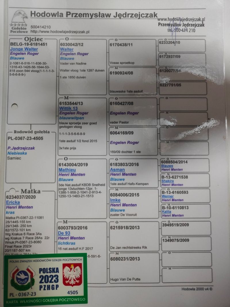 Oryginalny gołąb z Hodowli Przemysława Jędrzejczaka. Samica godna polecenia do dalszej hodowli. Więcej informacji na temat gołąbka znajdziecie w rodowodzie. 797686703