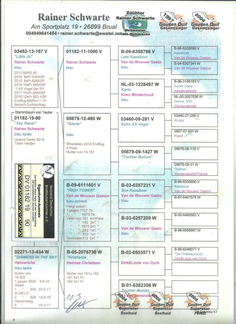 Oryginalny gołąb z hodowli Rainer Schwarte,szczegóły pochodzenia w rodowodzie,więcej informacji pod nr tel,:603 312 976,transport gołębi po wpłacie pieniążków na konto ,gołębie będą dostarczane kurierem 1-5szt 180zł,