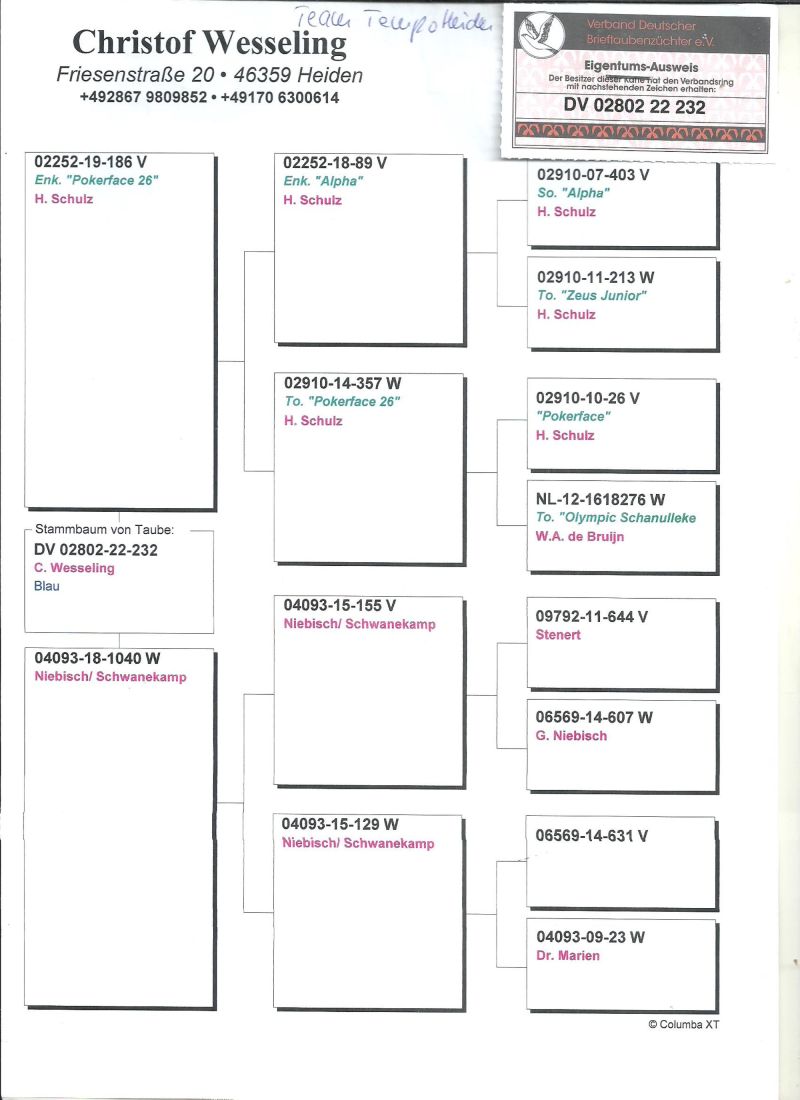 Oryginalny gołąb z hodowli Christof Wesseling,szczegóły pochodzenia w rodowodzie,więcej informacji pod nr tel,:603 312 976,transport gołębi po wpłacie pieniążków na konto ,gołębie będą dostarczane kurierem 1-5szt 180zł