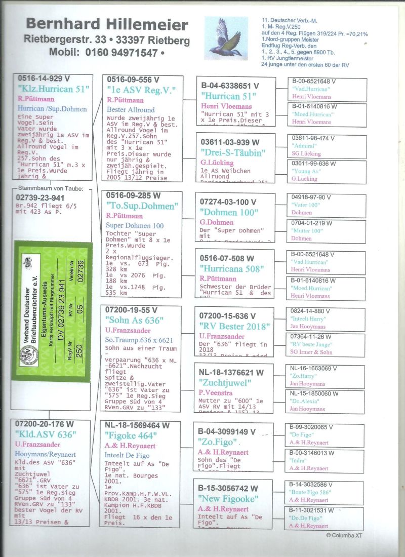Oryginalny gołąb z hodowli Bernhard Hillemeier,szczegóły pochodzenia w rodowodzie,więcej informacji pod nr tel,:603 312 976,transport gołębi po wpłacie pieniążków na konto ,gołębie będą dostarczane kurierem 1-5szt 180zł