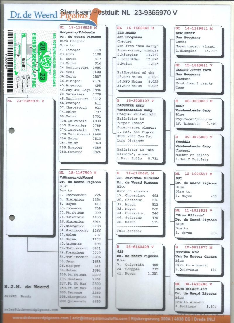 Oryginalny gołąb z hodowli H.J.M. de Weerd,szczegóły pochodzenia w rodowodzie,więcej informacji pod nr tel,:603 312 976,transport gołębi po wpłacie pieniążków na konto ,gołębie będą dostarczane kurierem 1-5szt 180zł