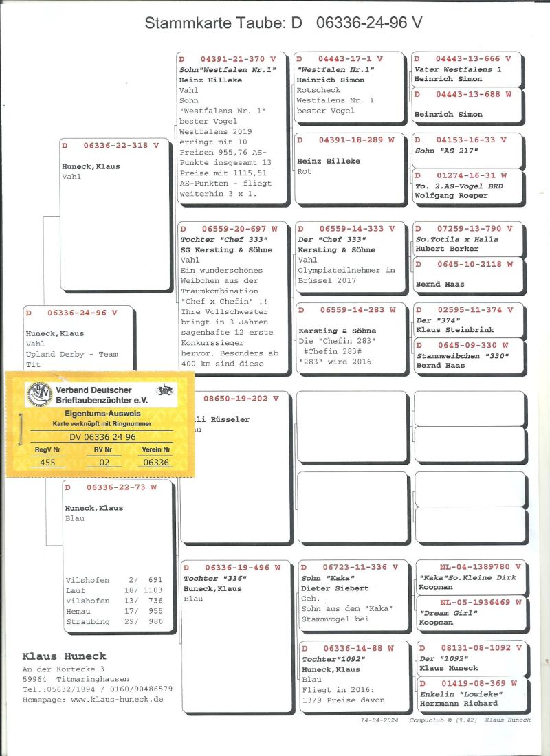 Oryginalny gołąb z hodowli Klaus Huneck,szczegóły pochodzenia w rodowodzie,więcej informacji pod nr tel,:603 312 976,transport gołębi po wpłacie pieniążków na konto ,gołębie będą dostarczane kurierem 1-5szt 180zł