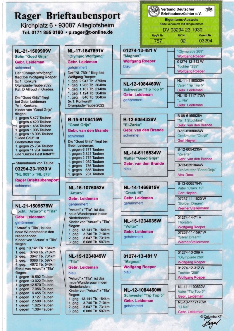 Opis:youtube.com/shorts/oXDwUUM5aVk?si=0OjHp5FQyBiwOb_v Wnuki "NL909" syna Goed Grijs wylatały w 2025, u Kerstinga-tauben.de 1/3114, 1/1893, 2/1893, 3/2236, 4 i 5/4518 w regionie Verband-405. Najlepszy gołąb oddziału 13/12. U Rainera Hubnera 2/1571 w regionie 452. Materiał najwyższej klasy światowej. Kojarzenie w obrębie rodziny - nie krzyzówka. Bardzo dobry materiał do dalszej hodowli. Gołąb zaszczepiony przeciwko paramiksowirozie. Więcej informacji udzielę telefonicznie.