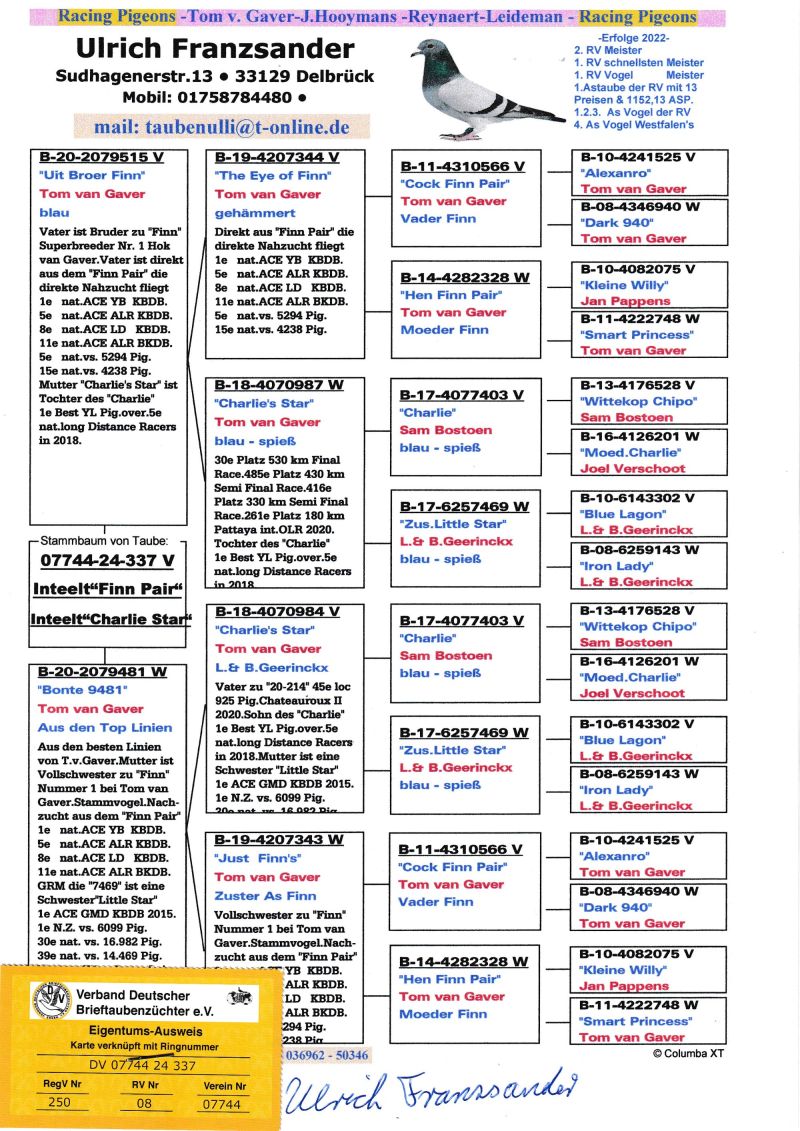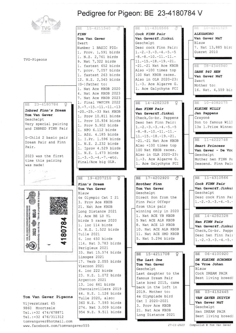 PL-013-25-5489 Wnuk brata Finna x wnuczka Finna 100% Tom Van Gaver OSTATNIA SZTUKA KUP TERAZ