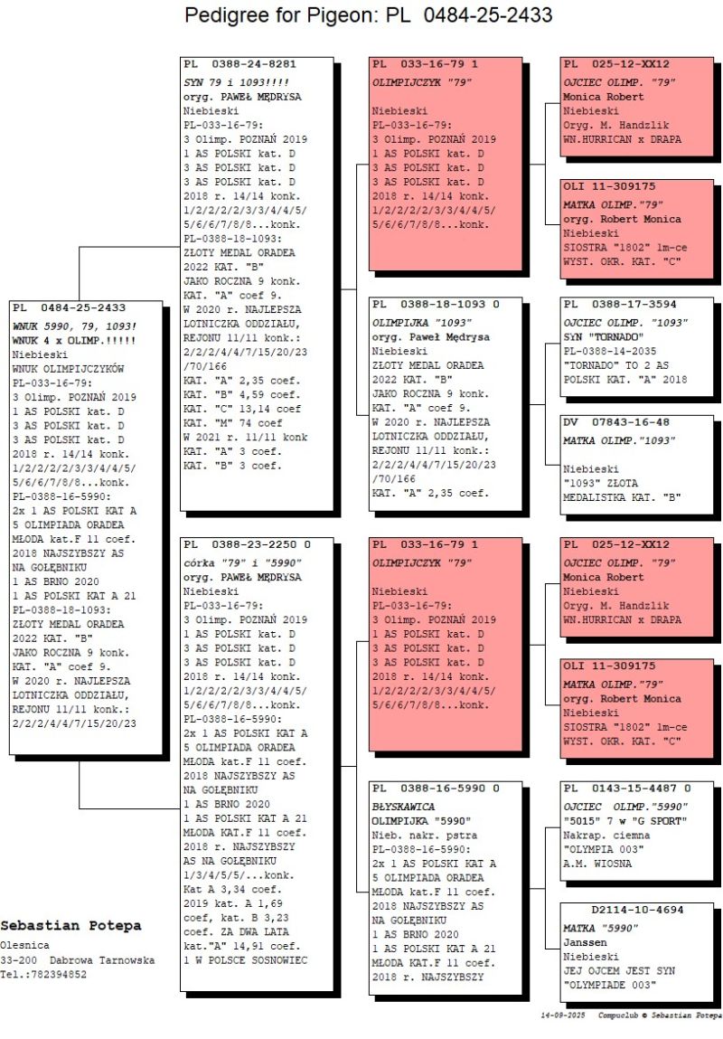 PL-0484-25-2433 - oryg. S. Potępa (100% P. Mędrysa) INBREDKA wnuczka 4 x OLIMP. 2 x 79, 1 x 5990, 1 x 1093 !!!