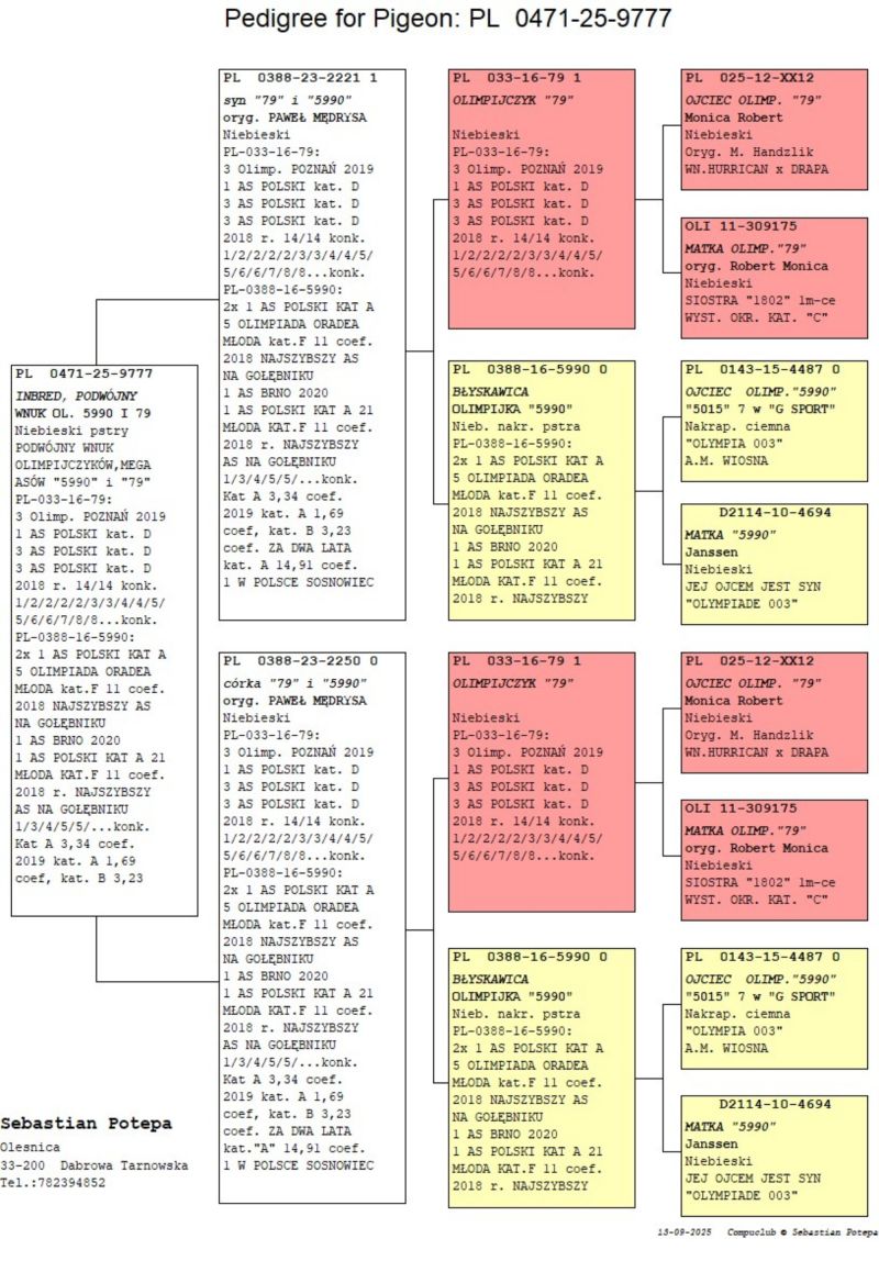PL-0471-25-9777 - oryg. S. Potępa (100% P. Mędrysa) INBREDKA WNUCZKA 4 x OLIMP. 2 x 5990, 2 x 79!!!