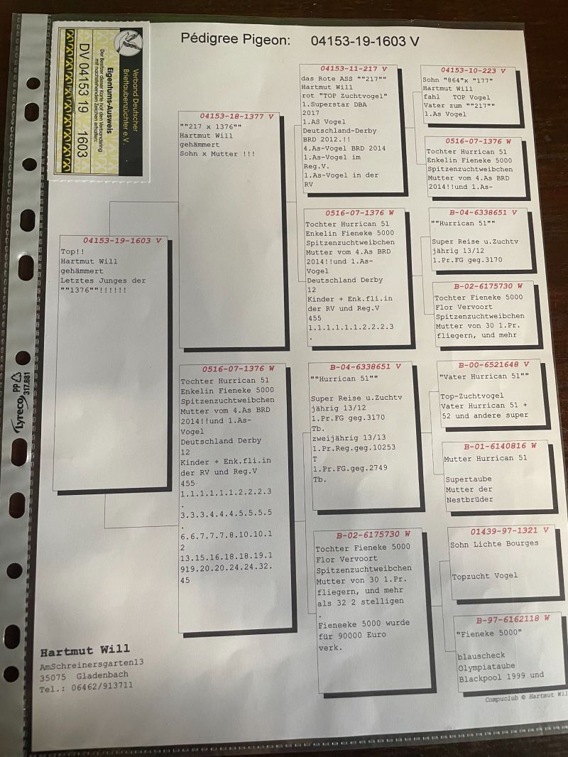 Oryginalny gołąb z hodowli Hartmut Will - Ostatni syn "1376"!! - córka "Hurrican 51"