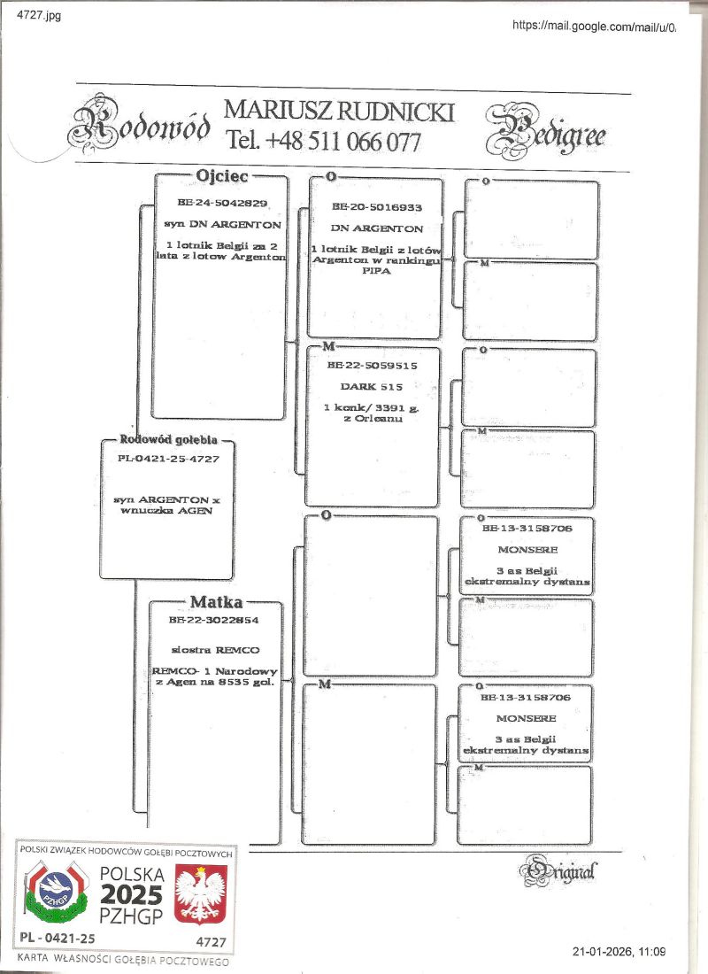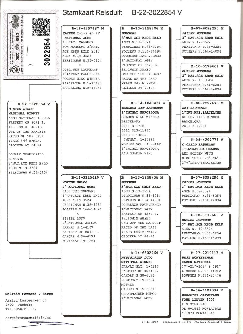 Matka to siostra Remco. REMCO wygrał jeden z najcięższych lotów narodowych ostatnich lat w Belgii w temperaturze ponad 30 stopni i z jednodniowym opóźnieniem ze startem ze względu na mgłę. Odbił się o świcie następnego dnia o godz. 04:24 i był pierwszym gołębiem Belgii na 8535 gołębi z lotu Agen. REMCO to podwójny wnuk MONSERE, który był 3 lotnikiem Belgii na ekstremalnym dystansie. W rodowodzie linia NEW LAUREAAT. Ojciec syn DN ARGENTON- 1 lotnik Belgii z lotów Argenton. Szczegóły pochodzenia w rodowodzie i pod nr tel. 696 241 555