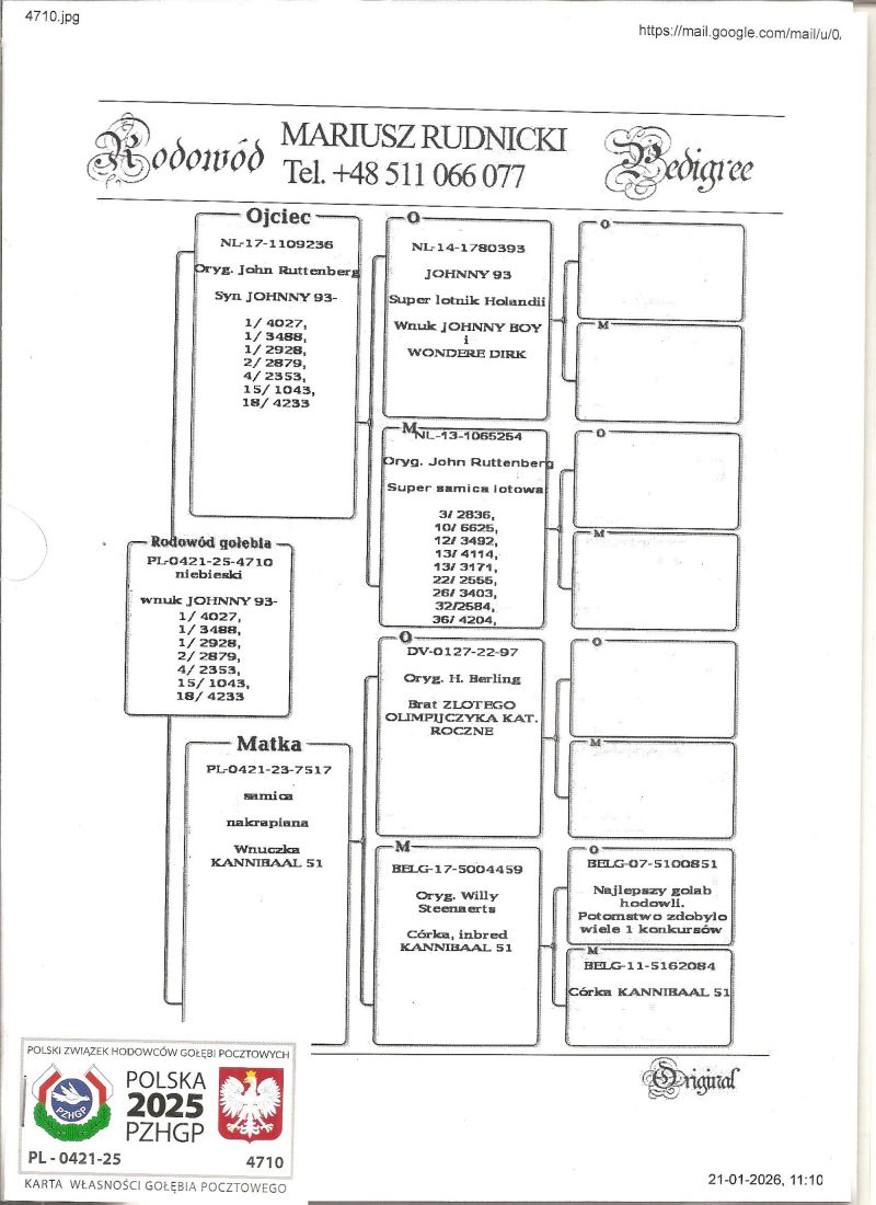 PL-0421-25-4710 - Po synu JOHNNY 93 - czołowy lotnik Holandii 3x1 konkurs x wnuczka Kannibaal 51