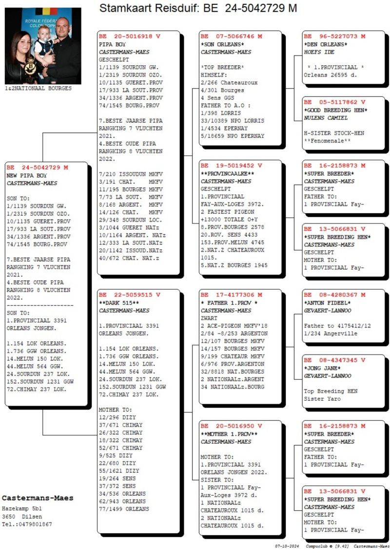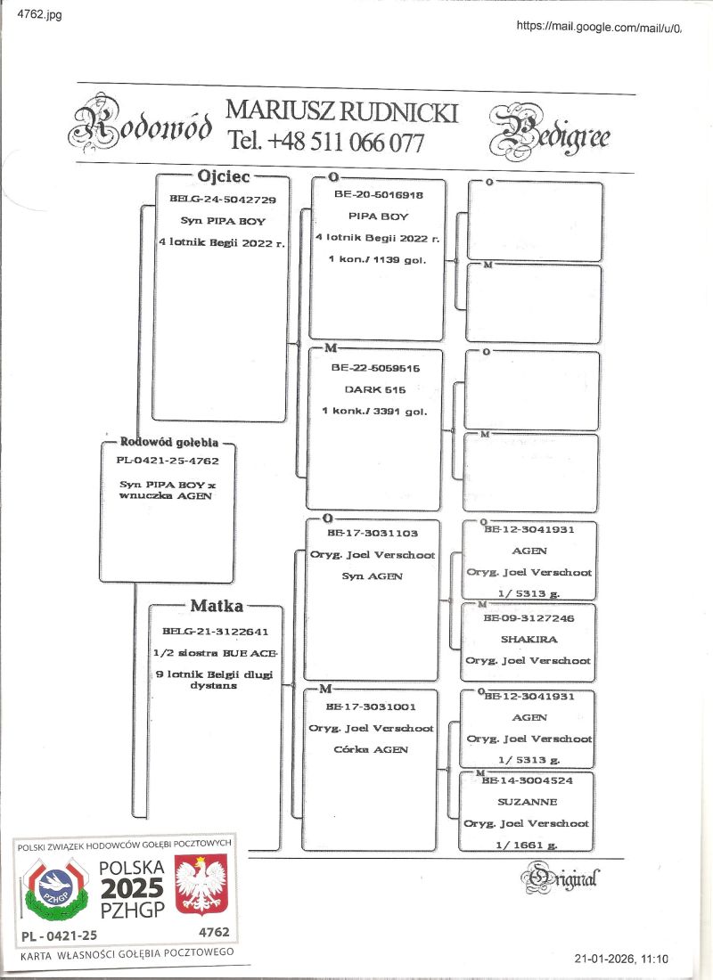 Matka Joel Verschoot, podwójna wnuczka AGEN- 1 narodowy konkurs Agen na 5283 goł. i wnuczka SUZANNE- 1/ 1661 g. Ojciec syn PIPA BOY- 4 lotnik Belgii. Szczegóły pochodzenia w rodowodzie i pod nr tel. 696 241 555