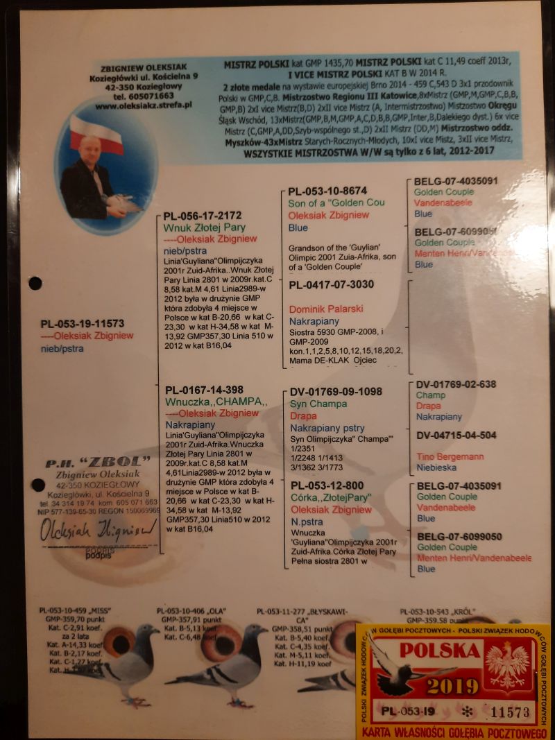 Oryginalny gołąb z hodowli Zbigniewa Oleksiaka. Gołąb odrobaczony i zaszczepiony salmovirem. Szczegóły pochodzenia w rodowodzie. Więcej informacji pod nr tel.: 669-823-001