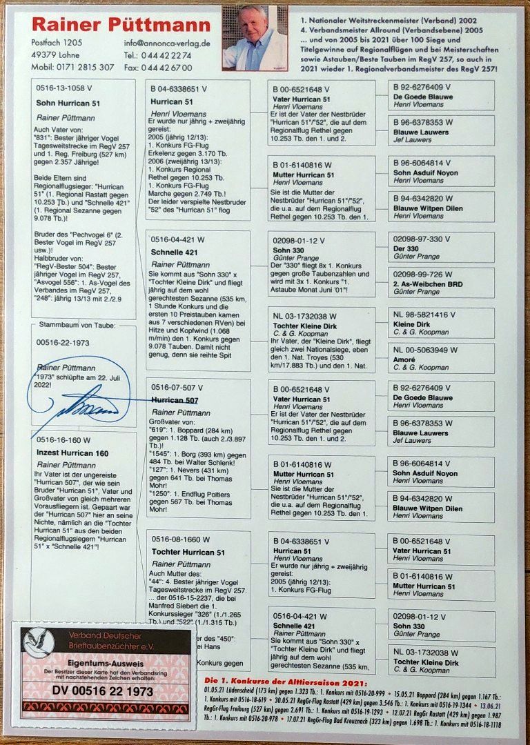 Oryginalny gołąb z hodowli Rainera Puttmanna. Gołąb odrobaczony i zaszczepiony salmovirem. Szczegóły pochodzenia w rodowodzie. Więcej informacji pod nr tel.: 669-823-001