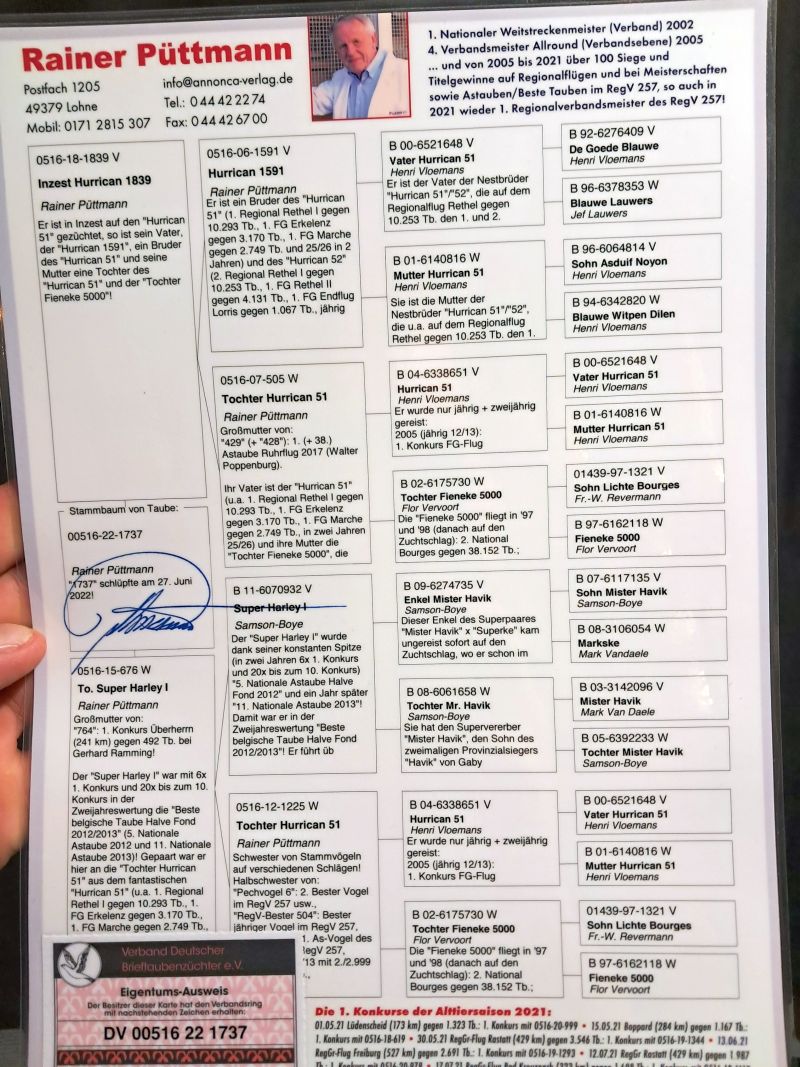 Oryginalny gołąb z hodowli Rainera Puttmanna. Gołąb odrobaczony i zaszczepiony salmovirem. Szczegóły pochodzenia w rodowodzie. Więcej informacji pod nr tel.: 669-823-001