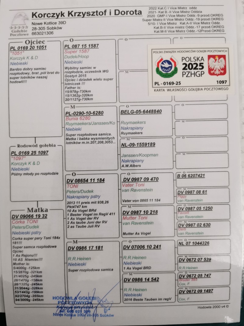 Oryginalny gołąb z hodowli Krzysztof i Dorota Korczyk. Samiec. Ojciec to pół brat do najlepszych naszych lotniczek.