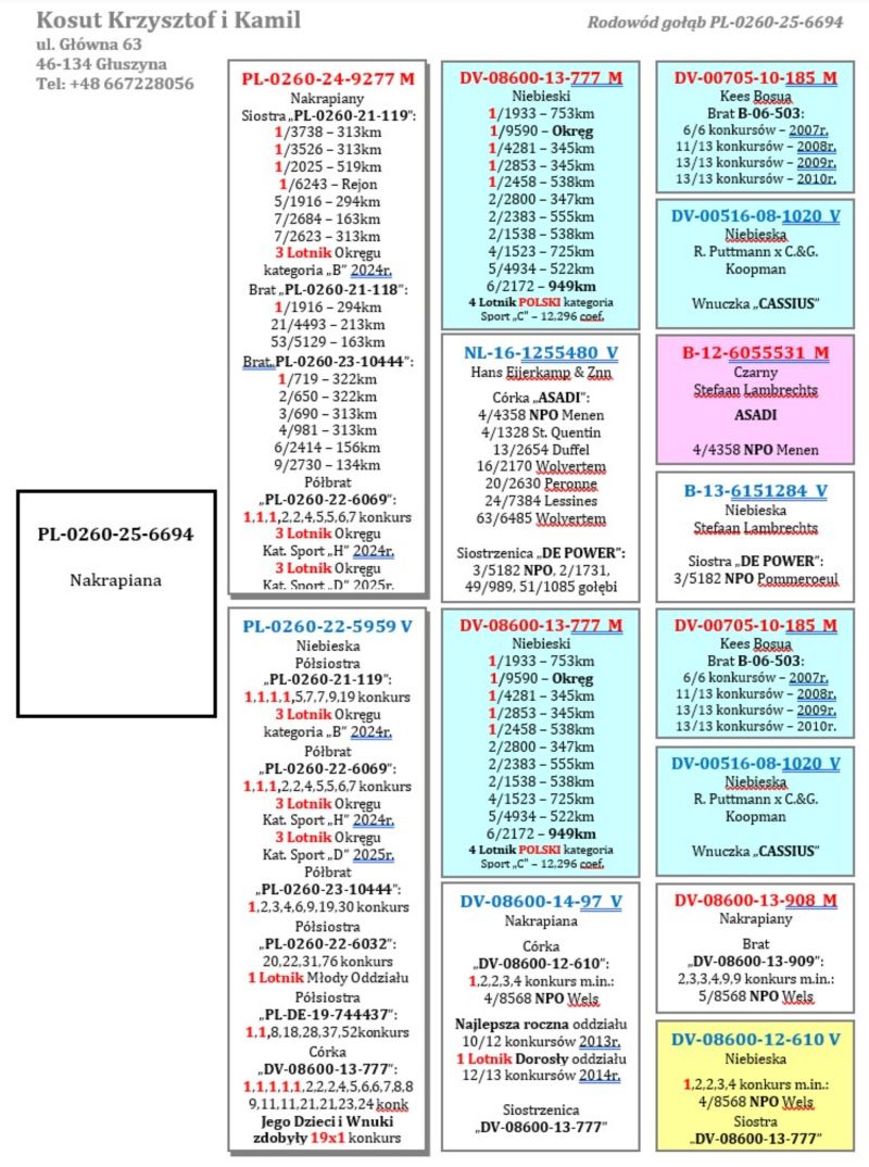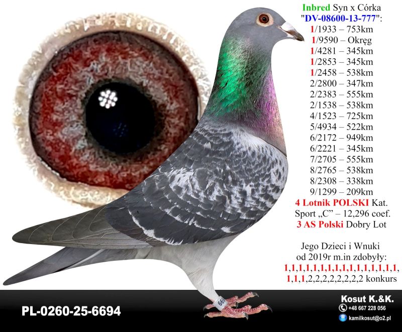 PL-0260-25-6694 – Inbred Syn x Córka „777” – 1,1,1,1,1 konkurs 4 Lotnik Polski oryg. Kosut K. & K. 85x1 konkurs Oddział