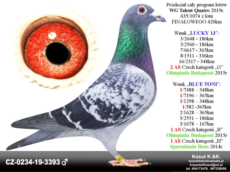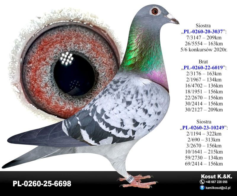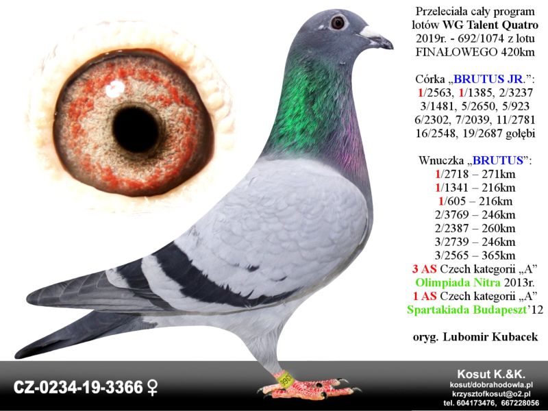 Oryginalny gołąb z hodowli Krzysztof i Kamil Kosut. Szczegóły pochodzenia w rodowodzie. Więcej informacji na stronie www.facebook.com/kosut.dobrahodowla oraz pod nr tel.: 667 228 056. Dostawa gołębi będzie realizowana po zakończeniu aukcji kurierem 165zł lub odbiór osobisty. Możliwy jest także odbiór osobisty.