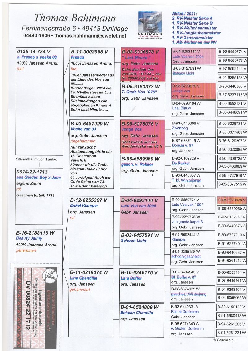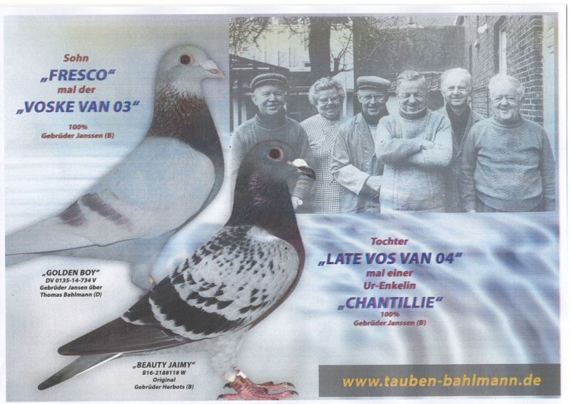 Gebruder Janssen.Oryginalny gołąb z hodowli Thomasa Bahlmanna. Szczegóły pochodzenia w rodowodzie. Więcej informacji pod nr tel.504780725