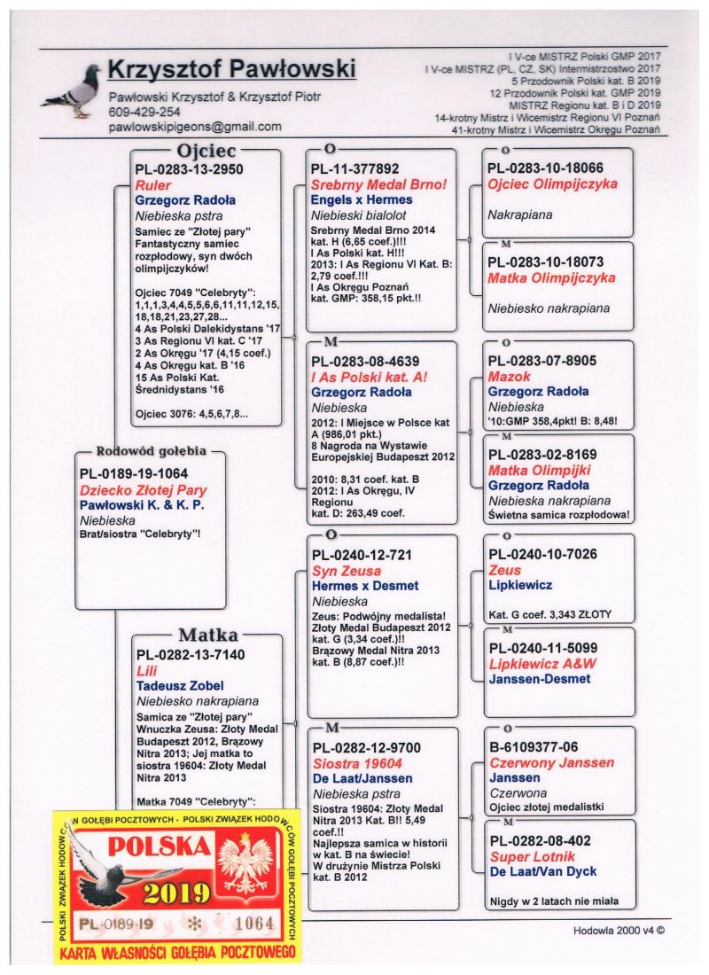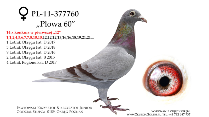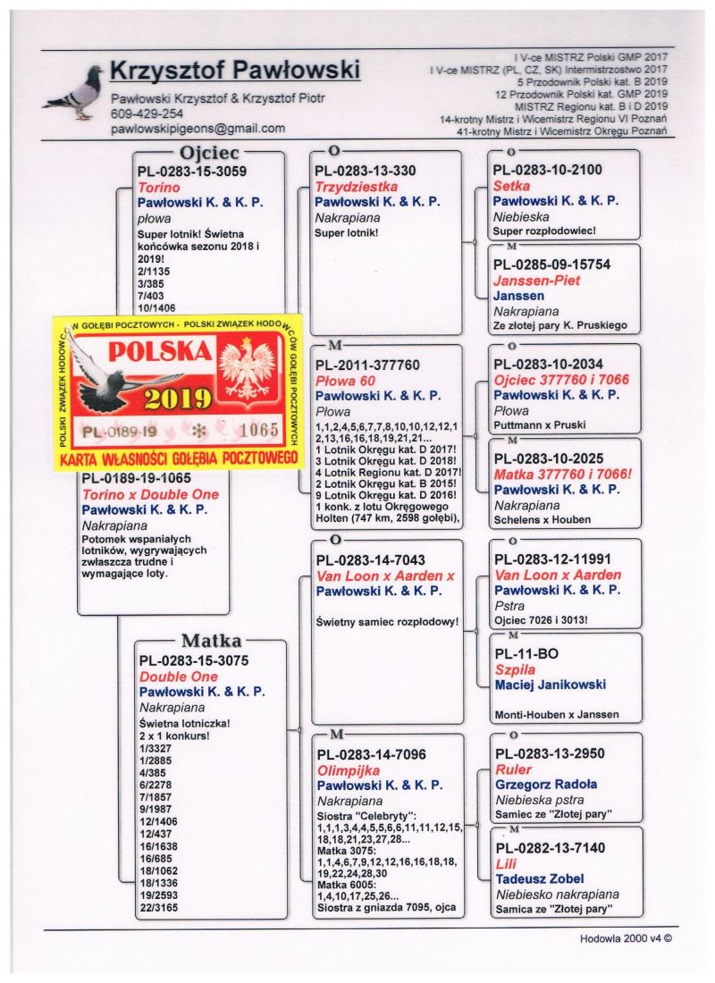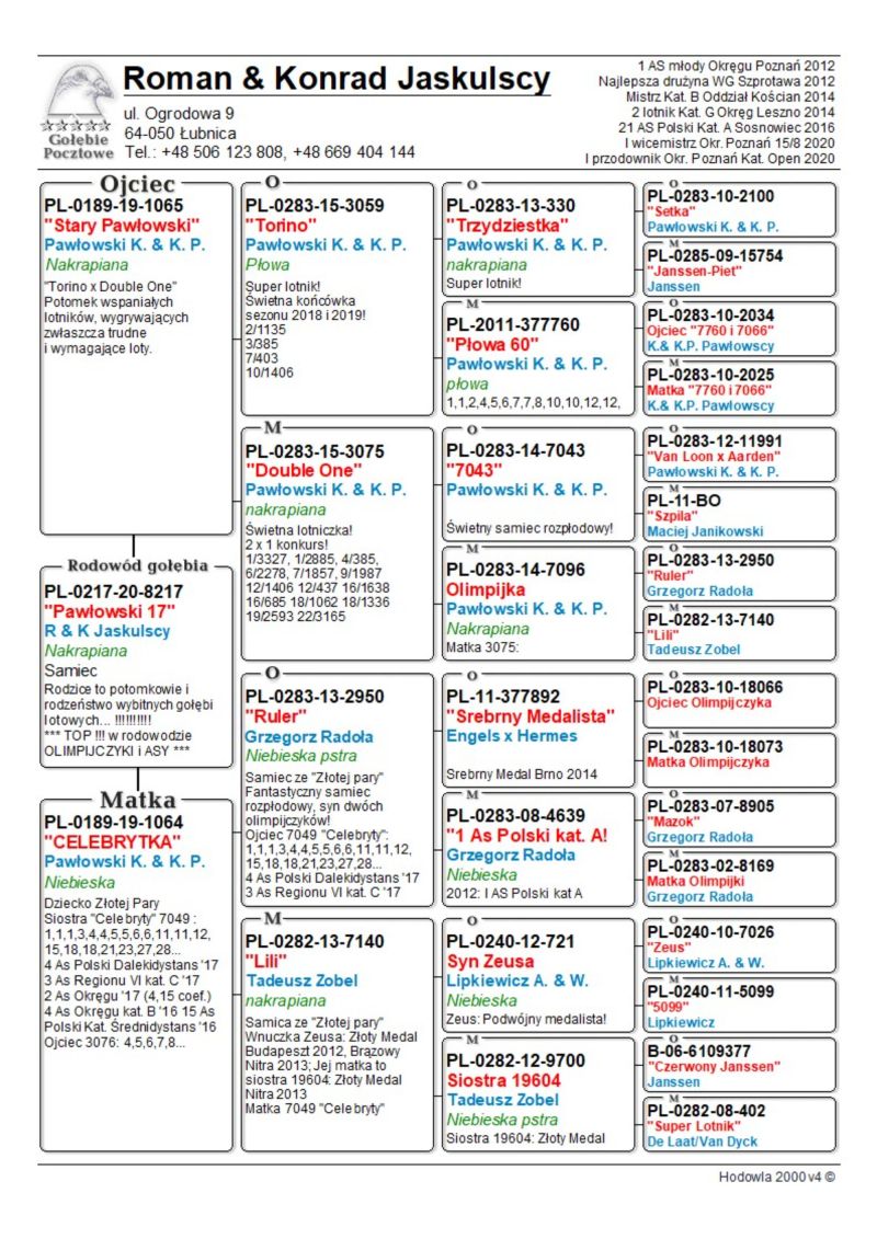 *** Oryginalny gołąb z hodowli Roman & Konrad Jaskulscy. Szczegóły pochodzenia w rodowodzie. Gołąb gotowy do sezonu lęgowego, zaszczepiony przeciwko paramyksowirozie (Columba) i salmonellozie (Salmo PT) *** Więcej informacji pod nr tel.: 506 123 808. Wpłata za gołębia na konto po zakończeniu aukcji. Możliwy odbiór osobisty lub dostawa realizowana przez kuriera w cenie od 100 do 160 zł. (w zależności od kuriera) *** ZAPRASZAMY RÓWNIEŻ NA INNE NASZE AUKCJE ***