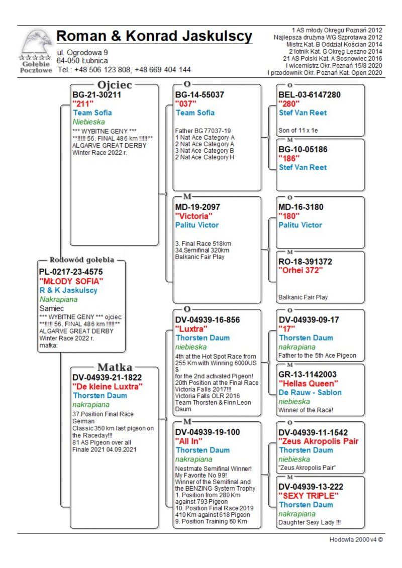 *** Oryginalny gołąb z hodowli Roman & Konrad Jaskulscy. Szczegóły pochodzenia w rodowodzie. Gołąb gotowy do sezonu lęgowego, zaszczepiony przeciwko paramyksowirozie (Columba) i salmonellozie (Salmo PT) *** Więcej informacji pod nr tel.: 506 123 808. Wpłata za gołębia na konto po zakończeniu aukcji. Możliwy odbiór osobisty lub dostawa realizowana przez kuriera w cenie od 100 do 160 zł. (w zależności od kuriera) *** ZAPRASZAMY RÓWNIEŻ NA INNE NASZE AUKCJE ***
