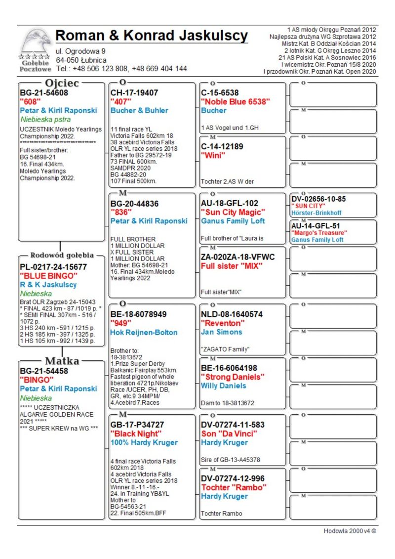 *** Oryginalny gołąb z hodowli Roman & Konrad Jaskulscy. Szczegóły pochodzenia w rodowodzie. Gołąb gotowy do sezonu lęgowego, zaszczepiony przeciwko paramyksowirozie (Columba) i salmonellozie (Salmo PT). *** Więcej informacji pod nr tel.: 506 123 808. Wpłata za gołębia na konto po zakończeniu aukcji. Możliwy odbiór osobisty lub dostawa realizowana przez kuriera w cenie od 100 do 160 zł. (w zależności od kuriera) *** ZAPRASZAMY RÓWNIEŻ NA INNE NASZE AUKCJE ***