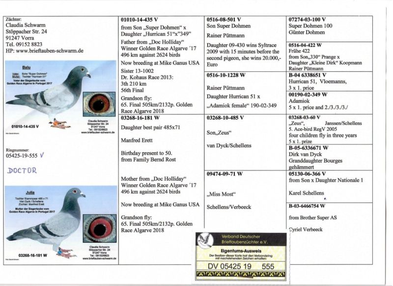<<<<< UWAGA >>>>> *** TYLKO KUP TERAZ *** Oryginalny gołąb z hodowli Stanislav Matuska - TALENT QUATRO. Szczegóły pochodzenia w rodowodzie. Gołąb gotowy do sezonu lęgowego, zaszczepiony przeciwko paramyksowirozie (Columba) i salmonellozie (Salmo PT). Więcej informacji pod nr tel.: 669 404 144. Wpłata za gołębia na konto po zakończeniu aukcji. Możliwy odbiór osobisty lub dostawa realizowana przez kuriera w cenie od 100 do 160 zł. (w zależności od kuriera) *** ZAPRASZAMY RÓWNIEŻ NA INNE NASZE AUKCJE ***