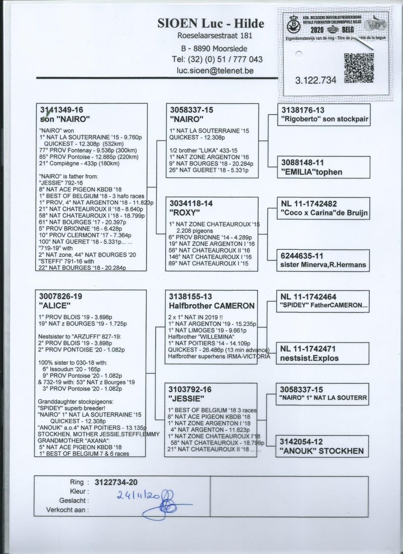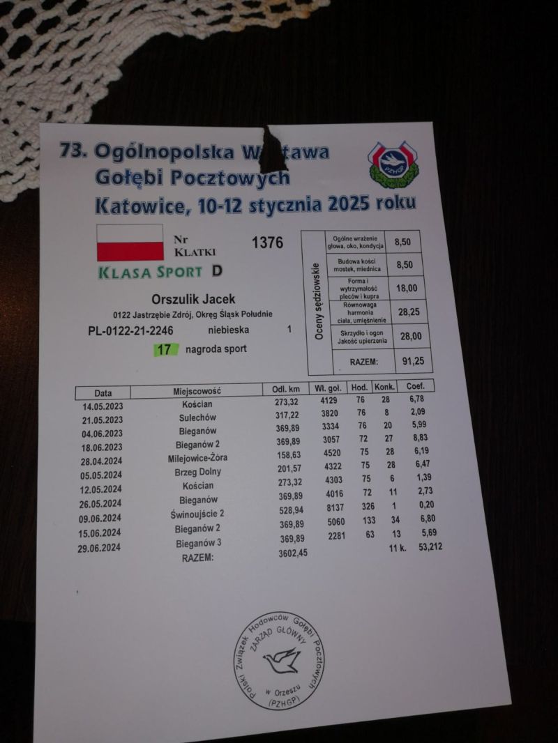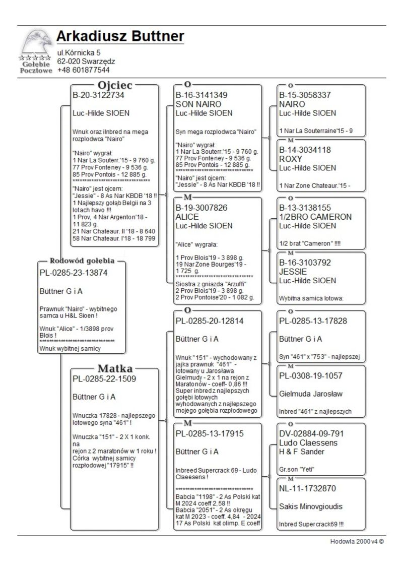 Extra samczyk wnuk wybitnej samicy rozpłodowej "17915" , matki i babki wielu super gołębi m.in babki 2051 - 17 as Polski kat E w 2024 roku oraz babki 1198 - 2 Asa Polski kat M w 2024 roku (12 na świecie) ! Ojciec to oryg H & L Sioen - który jest wnukiem Nairo ( najlepszy samiec rozpłodowy) oraz linia Cameron - 2 x 1 Narodowy w 2019 r na ponad 9 i 15 tyś g. (sprzedana w tym samym roku do Chin za 800 000 Euro). "791" - ojciec "ZigZag McQueen" - 117 poz w finale SAMDPR , ojciec "Lotniskowej" , najlepszej samicy rozpłodowej u Kol Krzyśka Kusia oraz dziadek 8755 - rezerwa na olimpiadę w kat olimpijskiej maraton . Jest też pradziadkiem PL-0122-22-2219 - w 2 sezony na 21 wkładań 20 konkursów - kat A coeff 9,08 a z dwóch lat do wystaw kat A-74,86 , kat B-65,94 a kat D-72,20 W 2023 roku zdobył 1 konk na ok 4100 gołębi z miejsc Sulechów a w 2024 roku 2 x 2 konk w oddz !!! oraz PL-0122-22-5510 w kat A w 2024 roku uzyskał coeff. 4,75 Zdobył też 1 konk na oddz z miejsc. Brzeg Dolny na 4322 gołębie !! Został też 4 Asem Polski kat krótki dystans 2024 z coeff 17 z groszem z 5 lotów do kat A właśnie dla Kolegi Jacka Orszulika !!!oraz ojciec , dziadek i pradziadek wielu wybitnych gołębi rozpłodowych i lotowych na wielu gołębnikach !! "327" - babka 1 i 4 Asa WG Kużnica -16169-15 - 1 As WG Kuźnica - 4 poz w Finale - sprzedany za 8600 Euro na pipa.be....Babka 1 ASA odziału 0500 Chorzów Bytom Świętochłowice z 13 konkursami (7 samicą Rejonu Radzionków na ponad 17000 zgłoszonych gołębi !!) "870" - matka 14196 - 2 as oddz kat A , 8701 - ojciec 2 x 10 gołąb z finału WG Kuźnica 2015 i 2016 , i wielu wielu innych innych.Babka 1 gołębia z finału WG Podhale 2024 dla Kol. Bogdana Bieli. Babka super samca rozpłodowego u Kol Jacka Orszulika, matka "17915" - "17915" - wybitna samica rozpłodowa - babka dwóch mega lotników na PLGP u Kol Krzysztofa Mrowieca oraz babka 2 super samic Lotowych u Kol Kazimierza Goździejewskiego ( jedna w kat M w 2023 roku miała coeff 4,84 a druga w 2024 roku 2,58 - 2 x 1 na oddział - w kat "I" - coeff 9 z haczykiem) "461" najważniejsze referencje z 2025/2026 roku: Prawnuk 5110- Kolegi Jacka Orszulika 2 As Polski kat A - kandydat na Olimpiadę 2026 w Dortmundzie !!!...z 2024 roku: 1 As Rejonu z 8 lotów rejonowych - prawnuczka 461 u Kol Adama Gasperowicza, prawnuk "461" wygrał finał na WG Podhale wygrywając 50 000 dla Kolegi Bogdana Bieli !- liczba jedynek jego wnuków , prawnuków i oczywiście dzieci będzie około stu a kilkadziesiąt gołębi z 461 zajmowało top 10 w kat As w różnych kategoriach w różnych okręgach w Polsce- tylko w 2022 roku w 9 różnych oddziałach przeważnie prawnuki zdobywały 1 lokatę w oddz !!! Jego wnuczka została też na olimpiadzie w tym roku 4 gołębiem świata w kat H dla Kol Łukasza Reguły. !! Na screenie przykład jak potrafią siadać gołębie w oddz z linii 461 ... 3-prawnuk,4 -wnuk , 5-wnuk , 6 - roczna wnuczka - kat A 9 z groszem ma , 7 wnuk , 11 - wnuk oraz 15 - wnuk 461. oraz kolejny lot z 2020 roku : 1,2,3,5,7,8 wnuk oraz 15 prawnuk ? do tego roczna samiczka Kolegów Piotra I Marcina Żureckich z Kępna została 6 asem Polski w kat G ...tak leciała... 2 na 5200 g ze 174 km 8 na 4573 z 219 km 8 na 3583 g z 324 km 8 na 1764 g z 324 g 21 na 4535 g z 549 km - rej - coeff jak widać na zdjęciu 13,54 miała też szósty super lot była 25 na 4984 g coeff 5,02 1 goląb z Extra finału na WG Giewont 2022 dla Teamu Chudy-Molek to też linia "461" ojciec to syn mojej super wdowy 2161-12 ,, Dwie Prawnuczki .... u Kol Kazimierza Goździejewskiego ( jedna w kat M w 2023 roku miała coeff 4,84 ( 1 as okręgu Wałbrzych a druga w 2024 roku 2,58 - 2 x 1 na oddział (2 as Polski kat M w/g miesięcznika "Hodowca") - w kat "I" - coeff 9 z haczykiem), "461" to też pradziadek PL-0122-22-2219 - w 2 sezony na 21 wkładań 20 konkursów - kat A coeff 9,08 a z dwóch lat do wystaw kat A-74,86 , kat B-65,94 a kat D-72,20 W 2023 roku zdobył 1 konk na ok 4100 gołębi z miejsc Sulechów a w 2024 roku 2 x 2 konk w oddz !!! oraz pradziadek PL-0122-22-5510 w kat A w 2024 roku uzyskał coeff. 4,75 Zdobył też 1 konk na oddz z miejsc. Brzeg Dolny na 4322 gołębie !! Został też 4 Asem Polski kat krótki dystans 2024 z coeff 17 z groszem z 5 lotów do kat A właśnie dla Kolegi Jacka Orszulika !!! oraz wiele,wiele innych.....od 2017 roku 30x mistrzostwo oddz w różnych kategoriach w tym 2019-2021 3 x z rzędu supermistrzostwo oddziału Poznań, więcej lub 601 877 544