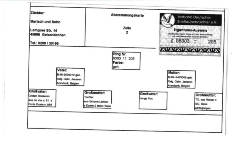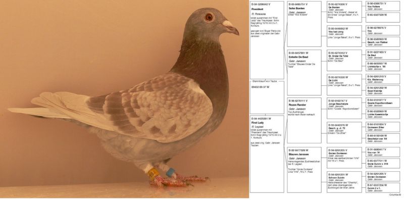 Bazowe gołębie u Jos De Klak, Koopman, Eijerkamp itd. Linia 019 18x1 , Vos 81, Klamper. DV 1706 jest córką rezerwowego gołębia na Olimpiadę 1,1,2,3,3,5,6,6,8,10,11. zaszczepiony przeciwko paramiksowirozie i salmonelle. Więcej informacji udzielę telefonicznie.
