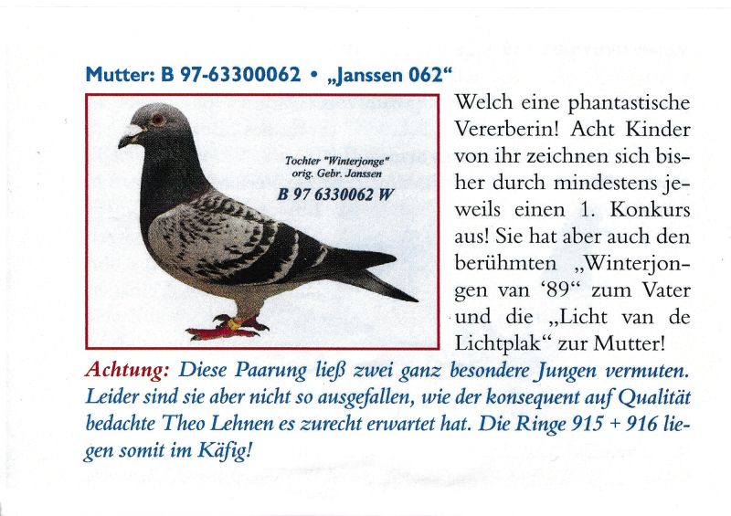 Bazowe gołębie u Jos De Klak, Koopman, Eijerkamp itd. Linia Geeloger 74, Jounge Merckx 15x1 , Winterjungen super samiec rozpłodowy. Lowieke jest ojcem trzech olimpijczyków, a jednocześnie wnukiem Winterjungen. Samica "Janssen 062" jest córką Winterjungen wydała dzieci 8x1 Theo Lehnen. Gołąb zaszczepiony przeciwko paramiksowirozie i salmonelle. Więcej informacji udzielę telefonicznie.