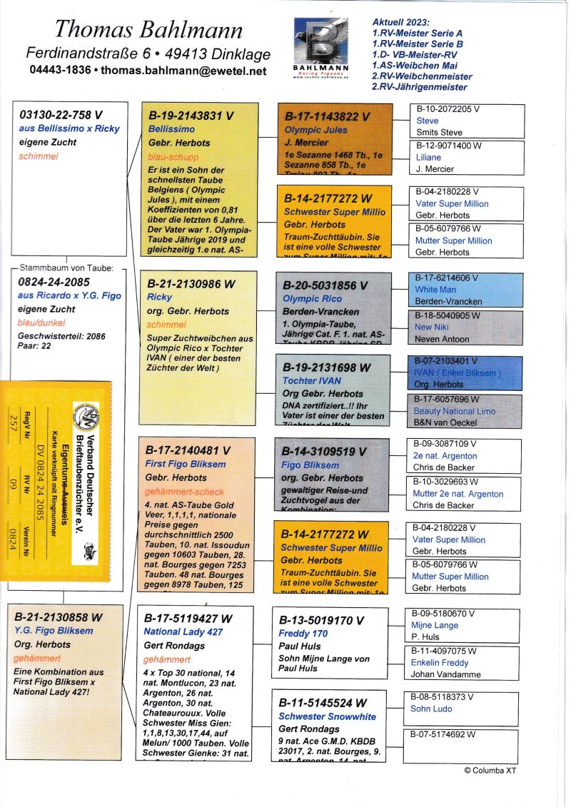 Oryginalny gołąb z hodowli Thomasa Bahlmanna. Szczegóły pochodzenia w rodowodzie. Możliwość wysyłki gołębi. Więcej informacji pod nr tel.504780725
