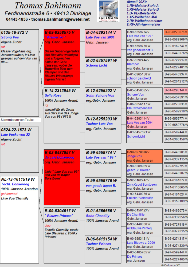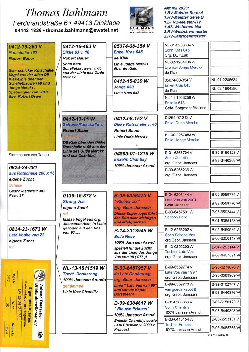 Oryginalny gołąb z hodowli Thomasa Bahlmanna. Szczegóły pochodzenia w rodowodzie. Możliwość wysyłki gołębi. Więcej informacji pod nr tel.504780725
