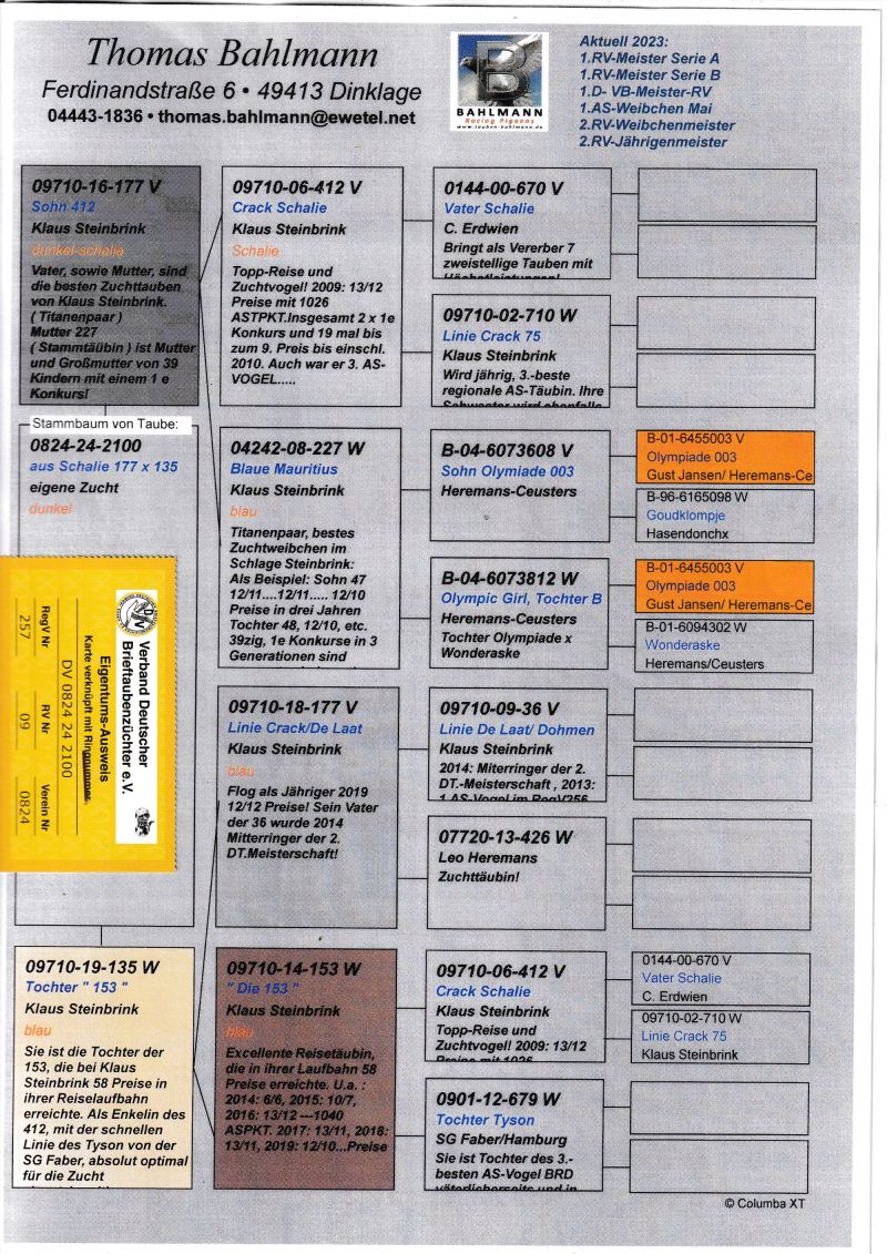 Oryginalny gołąb z hodowli Thomasa Bahlmanna. Szczegóły pochodzenia w rodowodzie. Możliwość wysyłki gołębi. Więcej informacji pod nr tel.504780725