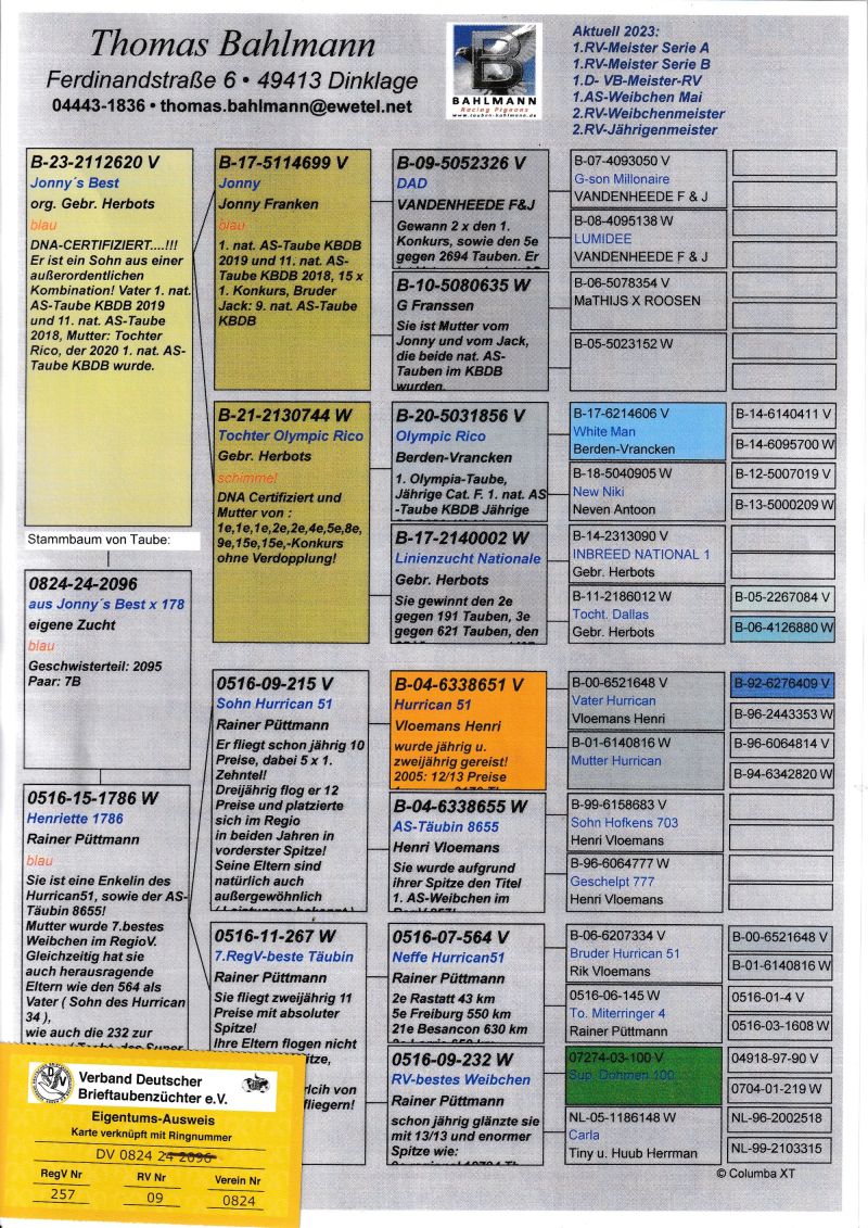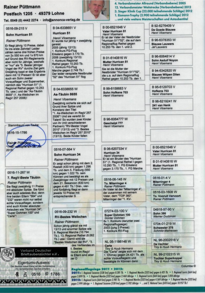 Oryginalny gołąb z hodowli Thomasa Bahlmanna. Szczegóły pochodzenia w rodowodzie. Możliwość wysyłki gołębi. Więcej informacji pod nr tel.504780725