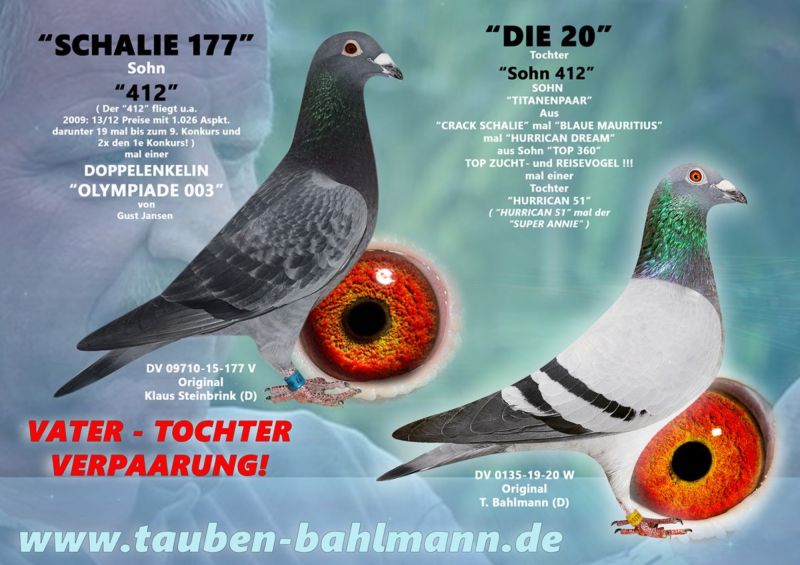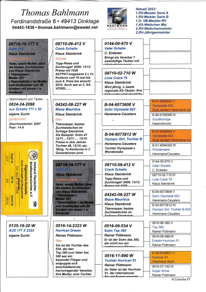 Oryginalny gołąb z hodowli Thomasa Bahlmanna. Szczegóły pochodzenia w rodowodzie. Możliwość wysyłki gołębi. Więcej informacji pod nr tel.504780725