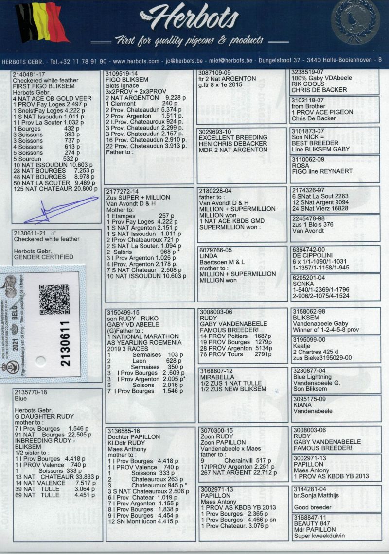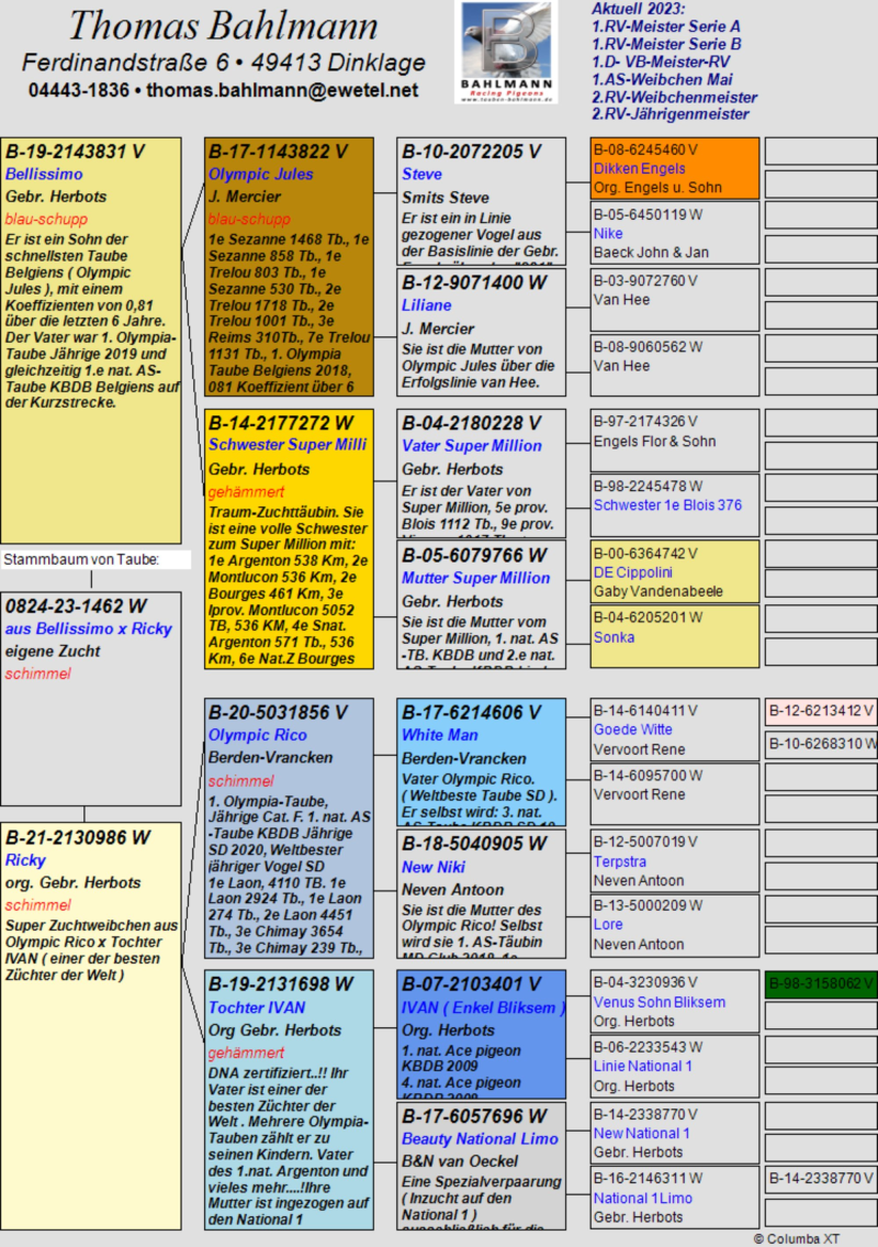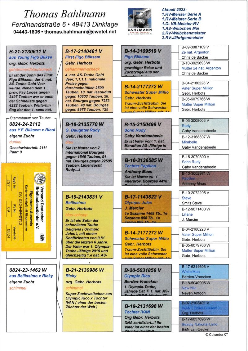 Oryginalny gołąb z hodowli Thomasa Bahlmanna. Szczegóły pochodzenia w rodowodzie. Możliwość wysyłki gołębi. Więcej informacji pod nr tel.504780725