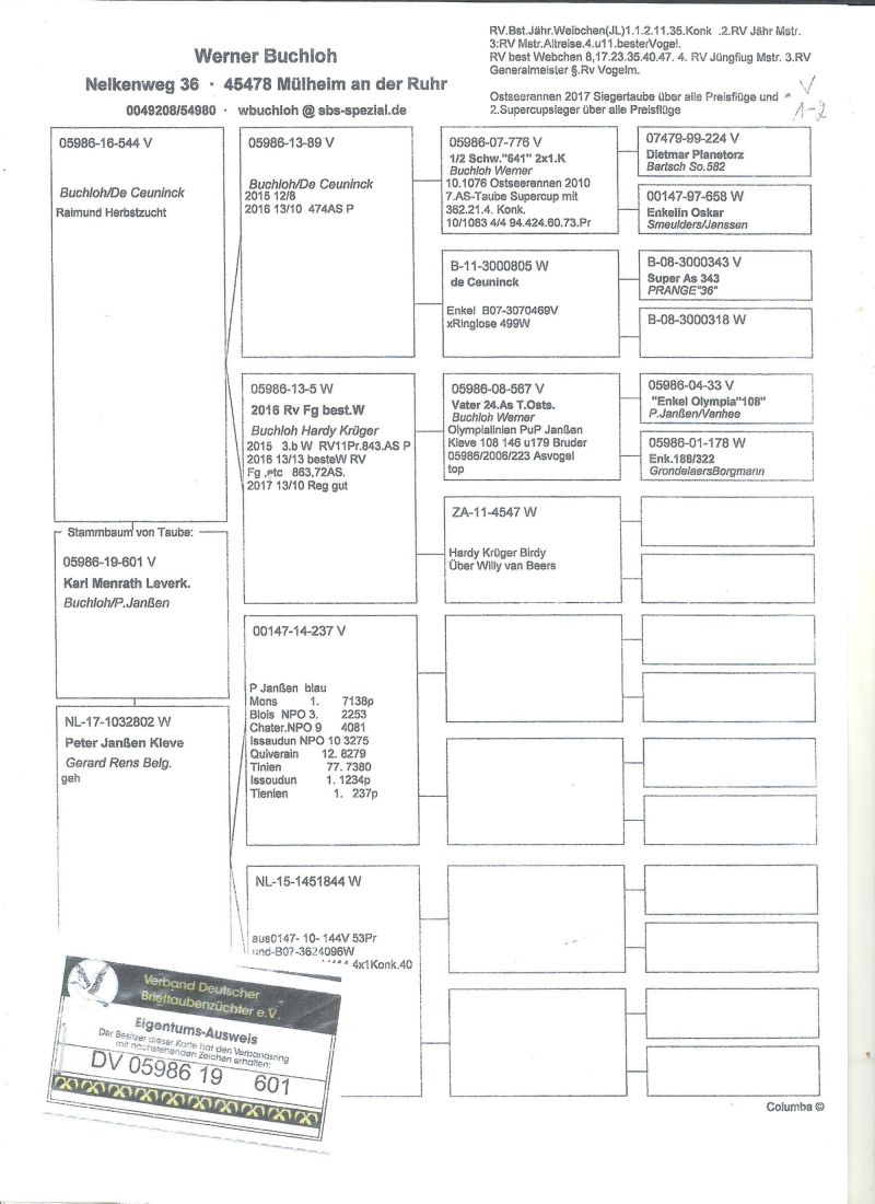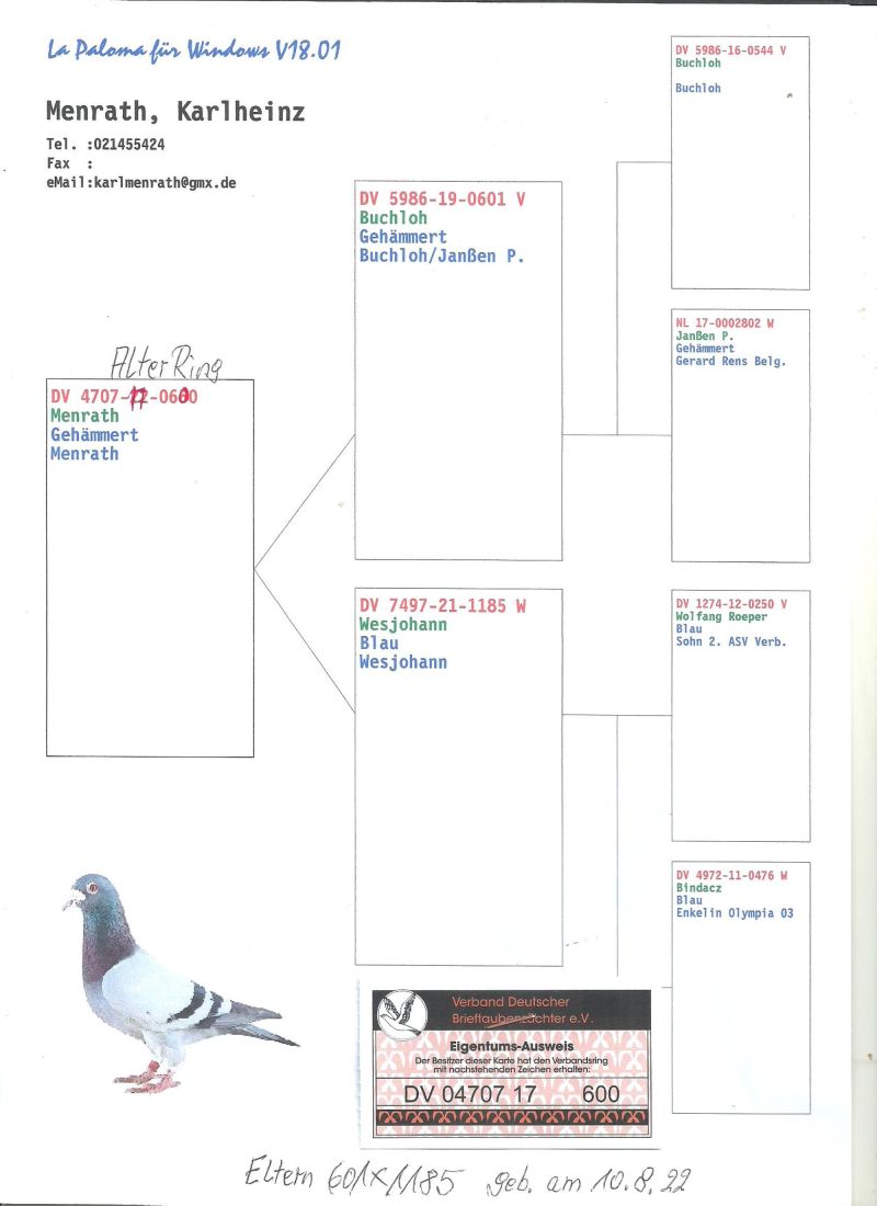 Oryginalny gołąb z hodowli Menrath Karlheinz,gołąb z roku 2022,szczegóły pochodzenia w rodowodzie,więcej informacji pod nr tel,:603 312 976,transport gołębi po wpłacie pieniążków na konto ,gołębie będą dostarczane kurierem 1-5szt 180zł
