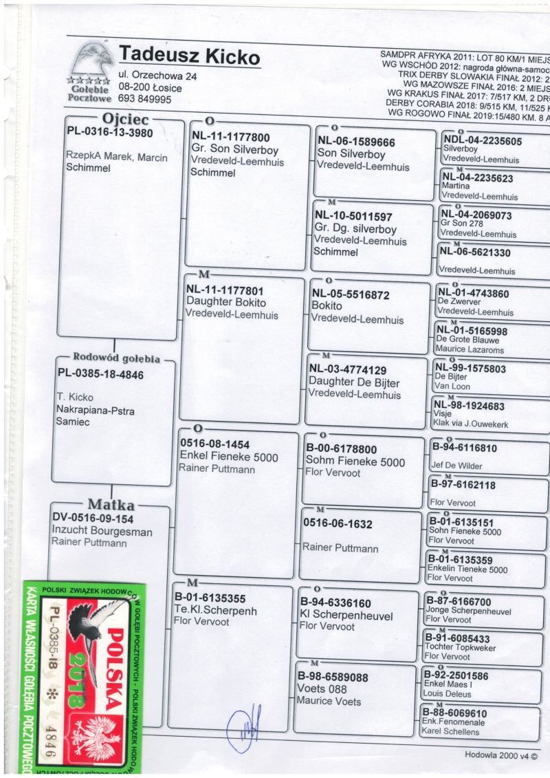 Oryginalny gołąb z hodowli T. Kicko. Więcej informacji w rodowodzie lub pod numerem telefonu 663699109. Po wygranej aukcji wpłata na konto pocztowe. Wysyłka kurierem po wpłacie. Koszt wysyłki 1-3 gołębi 150 zł.