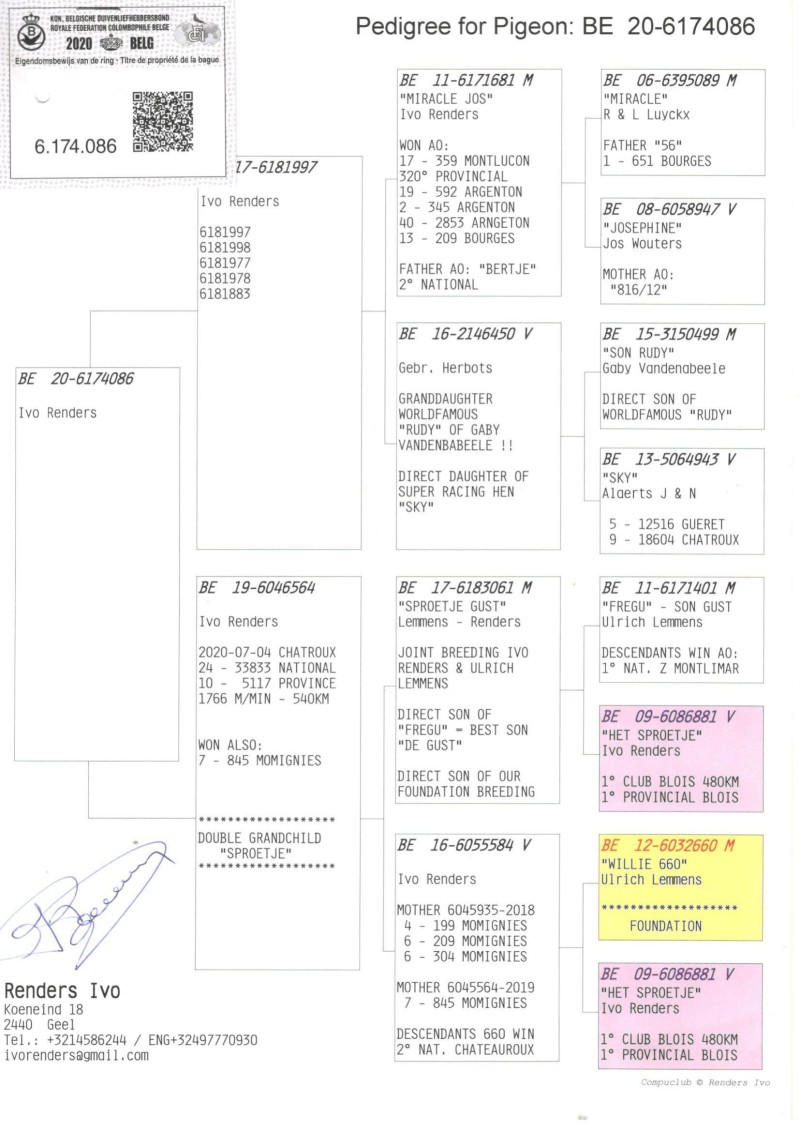Oryginalny gołąb z hodowli Ivo Renders. Szczegóły pochodzenia w rodowodzie. Więcej informacji pod nr tel.: 514746295 *Odbiór osobisty lub wysyłka kurierem na koszt kupującego