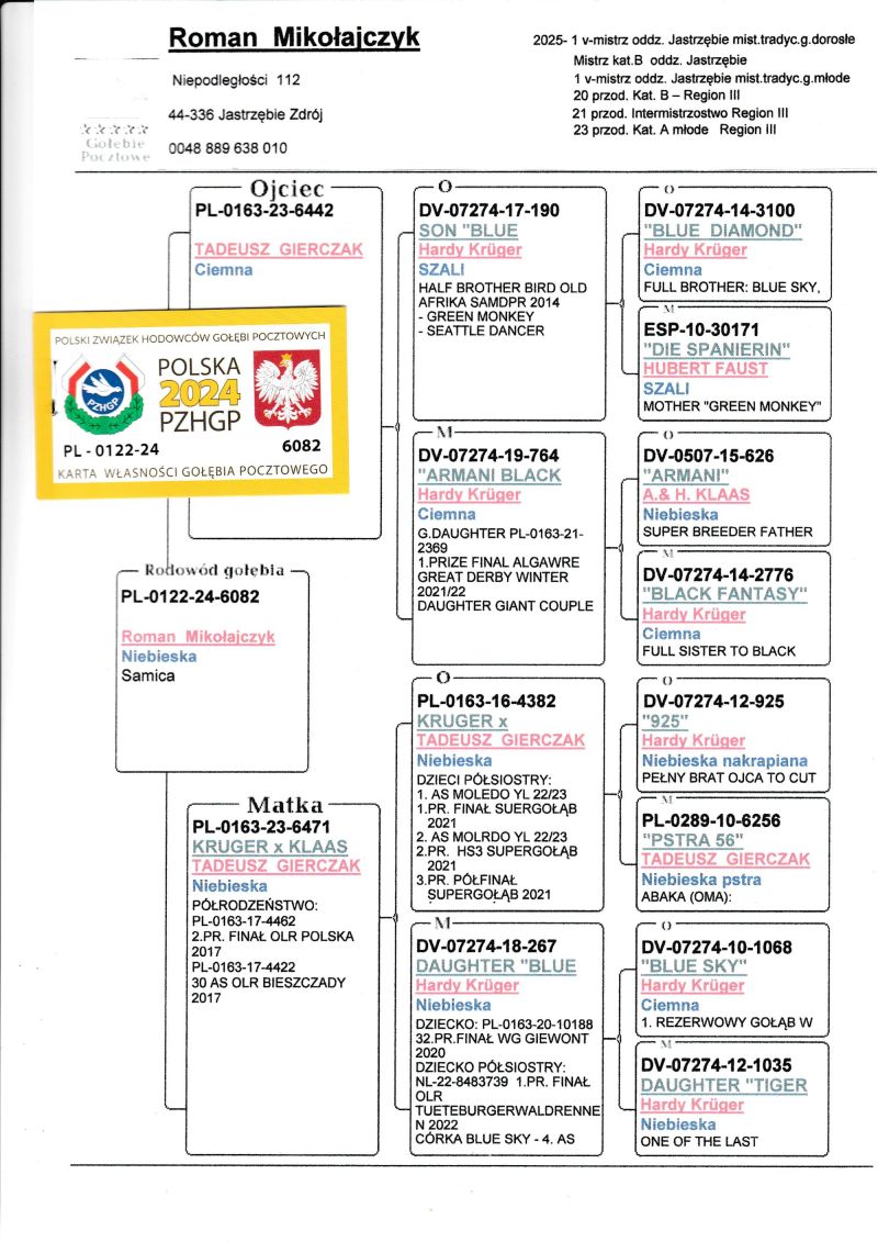 Gołąb z hodowli Romana Mikołajczyka. Szczegóły pochodzenia w rodowodzie. Kontakt w sprawie gołębi oraz transportu pod numerem telefonu +48 889 638 010
