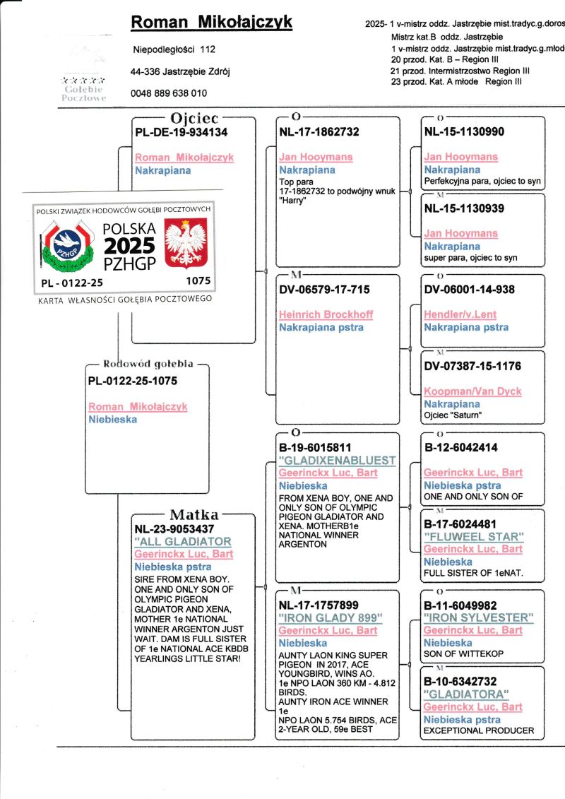 Gołąb z hodowli Romana Mikołajczyka. Szczegóły pochodzenia w rodowodzie. Kontakt w sprawie gołębi oraz transportu pod numerem telefonu +48 889 638 010