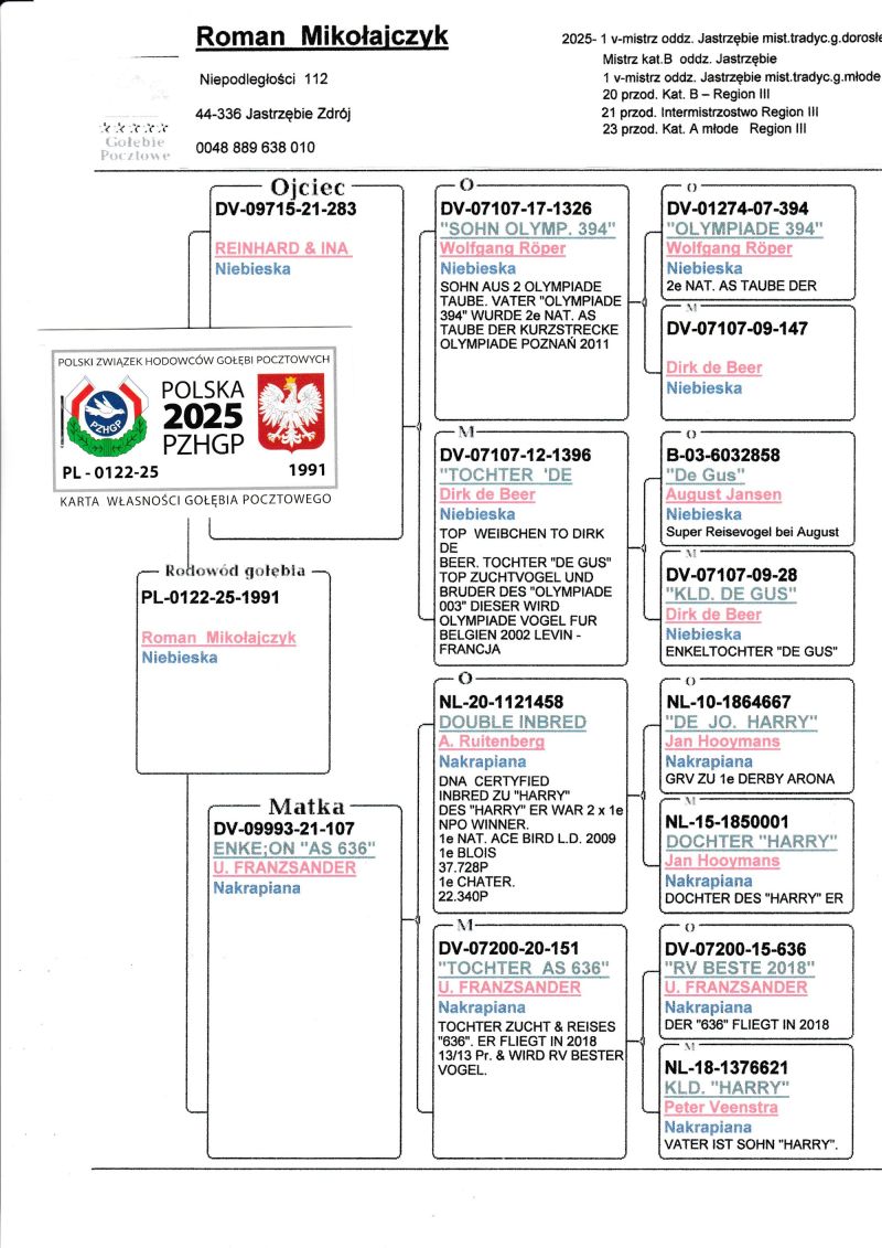 Gołąb z hodowli Romana Mikołajczyka. Szczegóły pochodzenia w rodowodzie. Kontakt w sprawie gołębi oraz transportu pod numerem telefonu +48 889 638 010