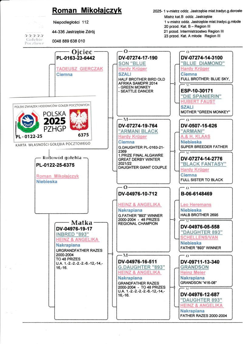 Gołąb z hodowli Romana Mikołajczyka. Szczegóły pochodzenia w rodowodzie. Kontakt w sprawie gołębi oraz transportu pod numerem telefonu +48 889 638 010