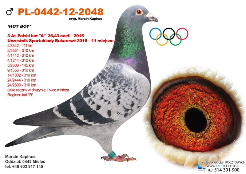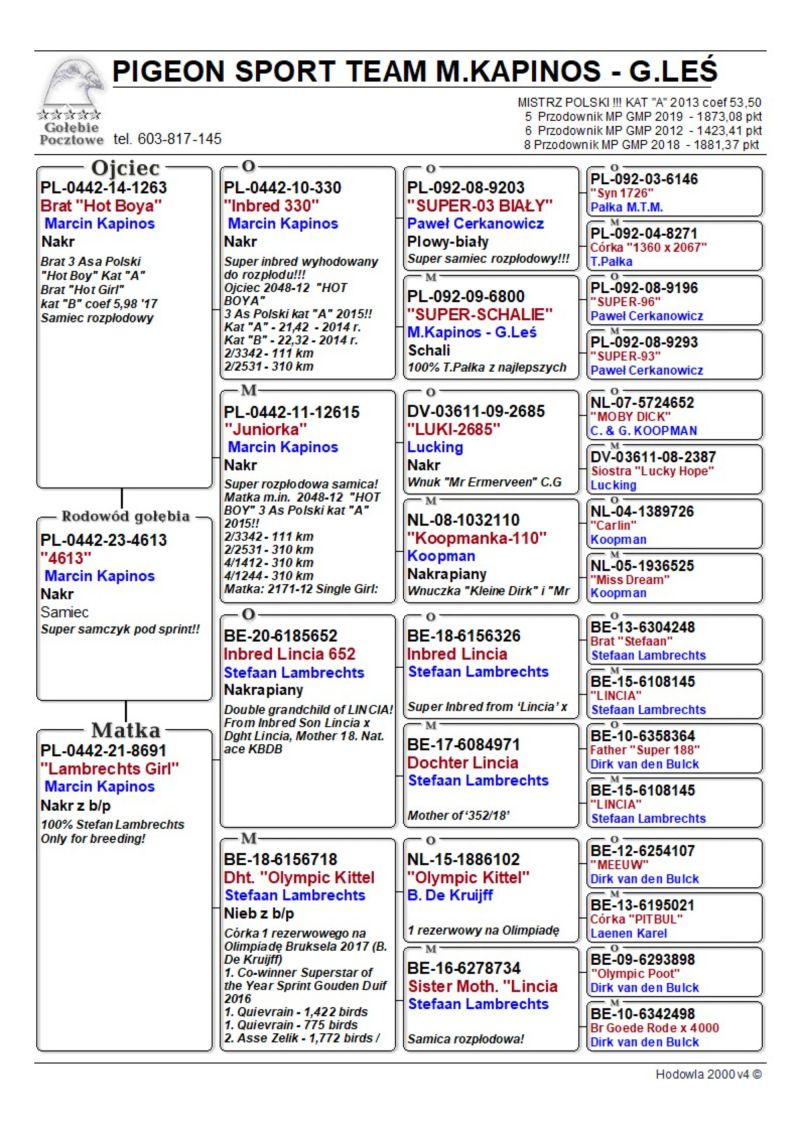 Samczyk bardzo ładnie zbudowany. Jest synem brata "Hot Boya" i córki inbred "Lincia" Stefana Lambrechta i "Kittel".