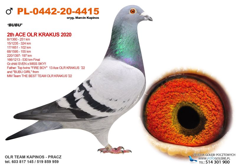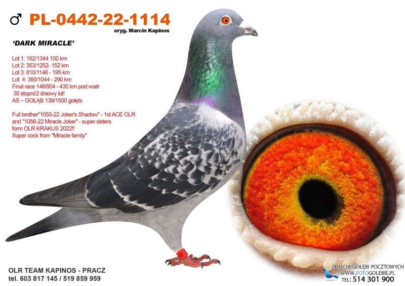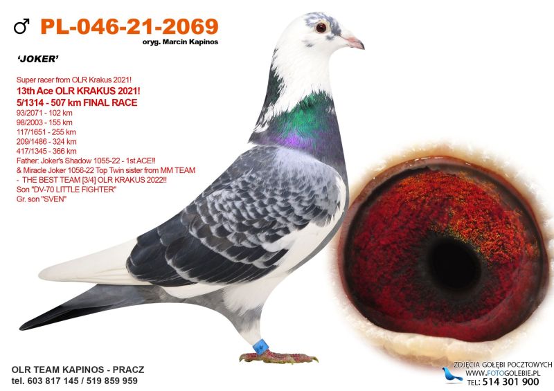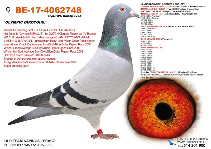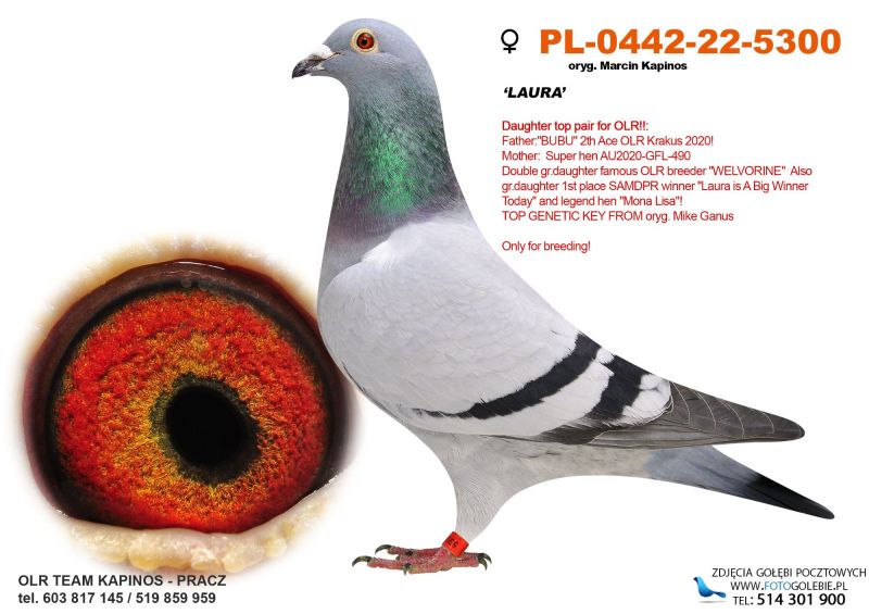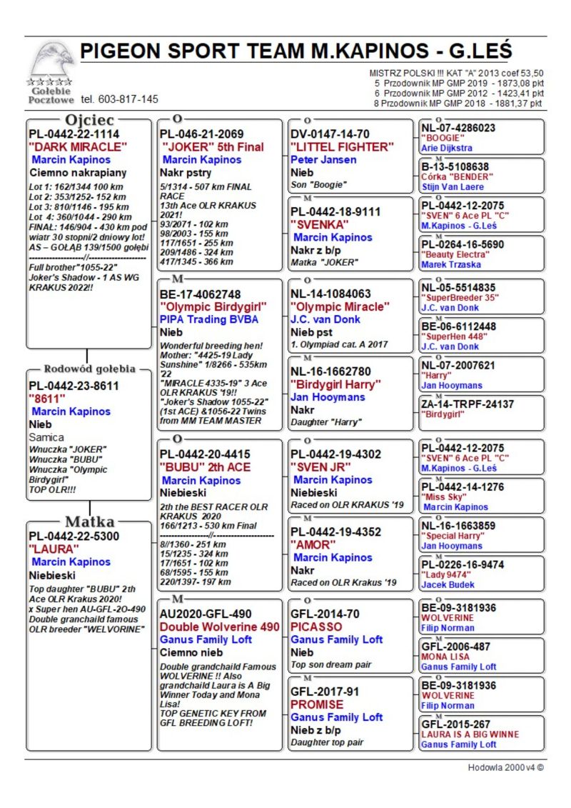 Samiczka bardzo ładnie zbudowana. Ojciec brat "1055-22" Brat 1 asa WG KRAKUS 2022. Matka córka "BUBU" i "Double Wolwerine 490".